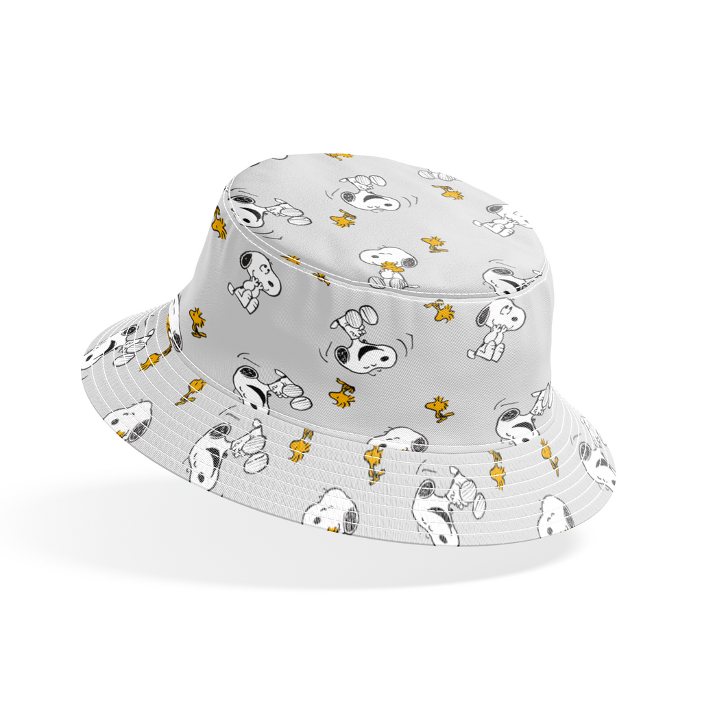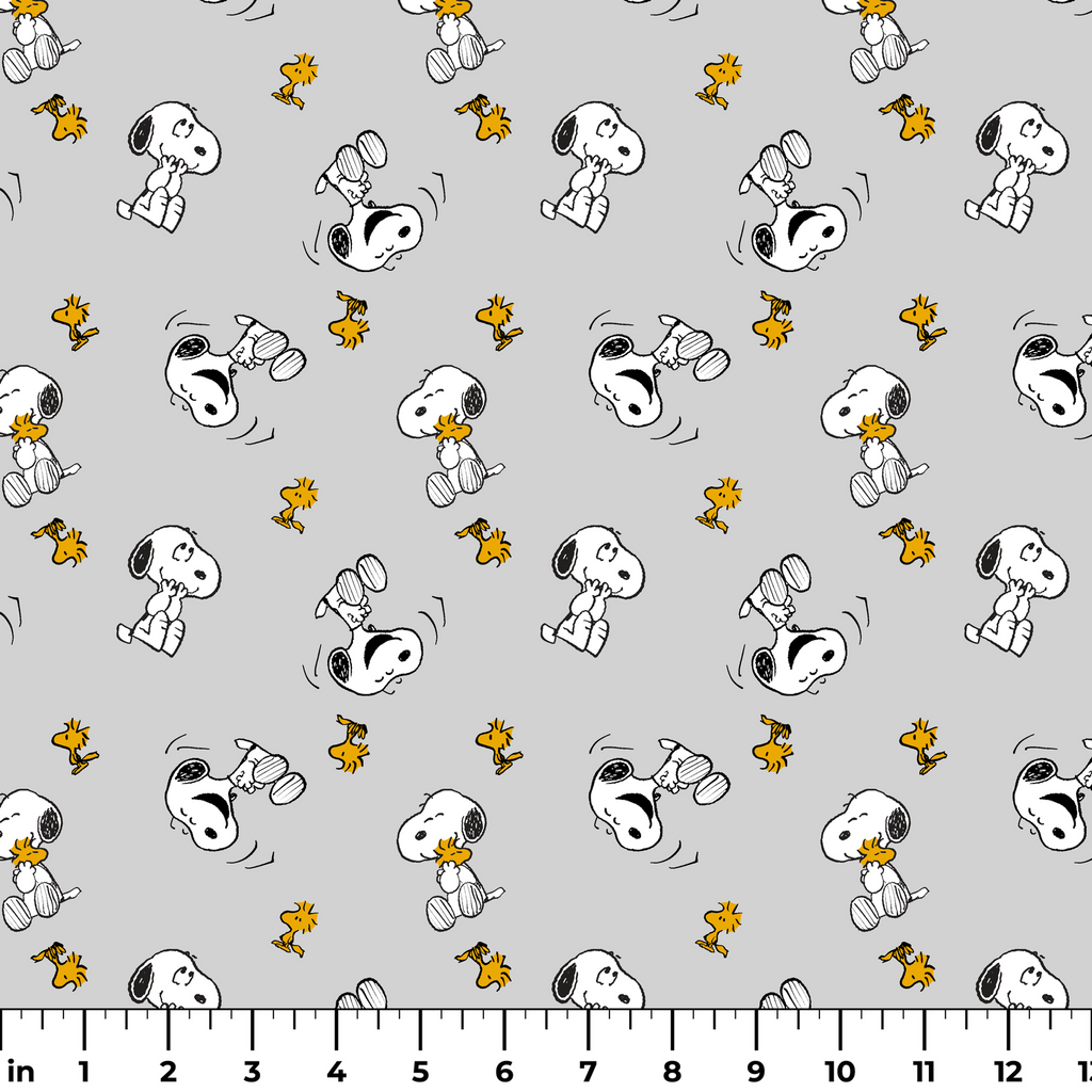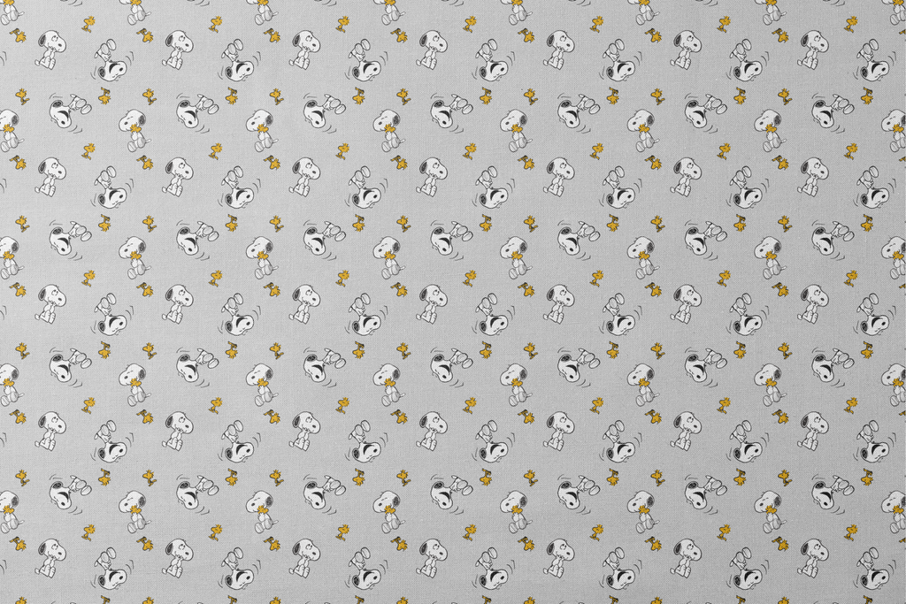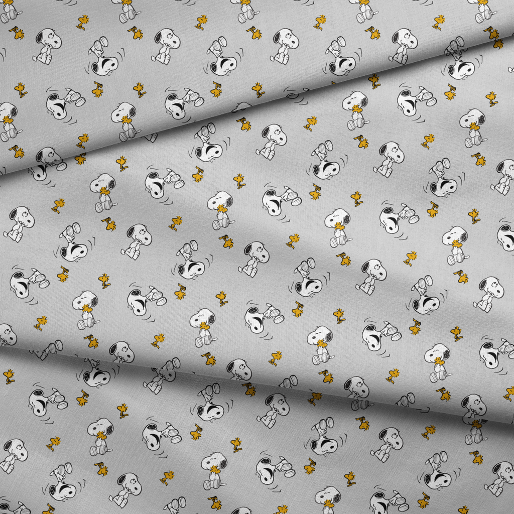 Adorable Peanuts pattern featuring Snoopy and Woodstock on a light gray background, perfect for children's apparel or bedding with its classic, whimsical character design.
