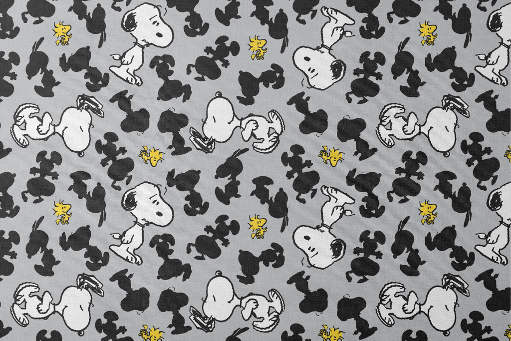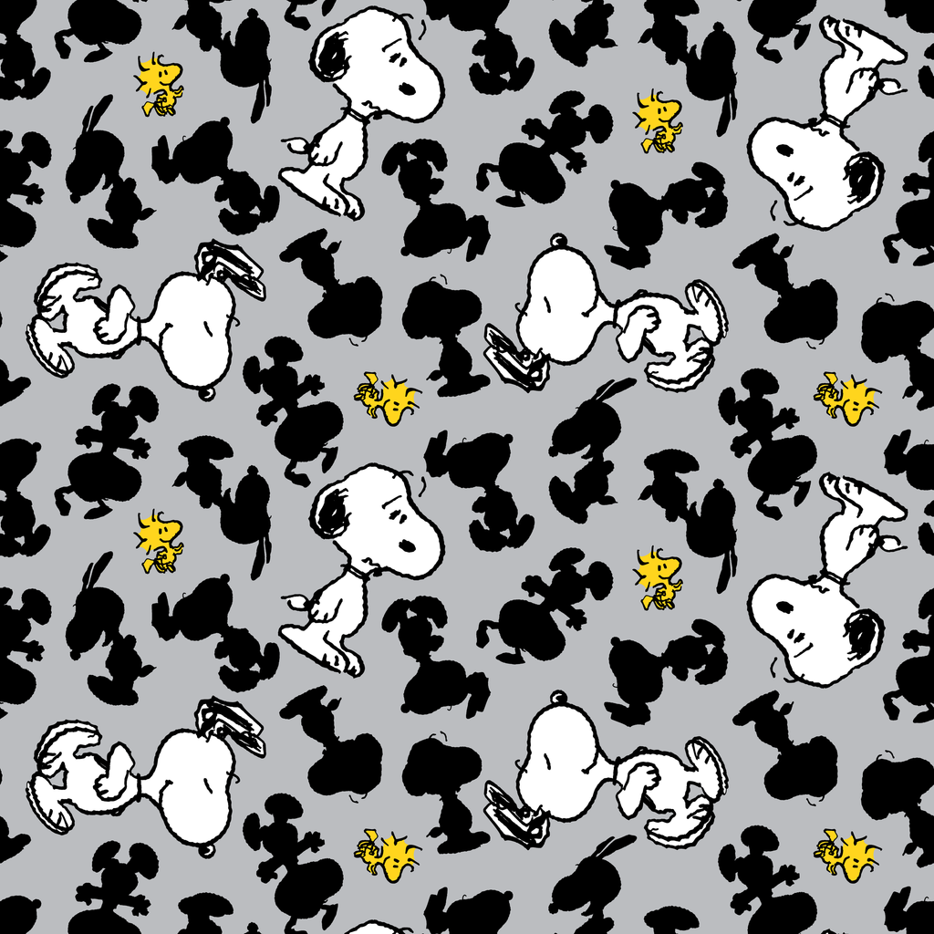 Classic Snoopy and Woodstock pattern on gray background. Whimsical repeating design featuring beloved comic strip characters in playful poses.