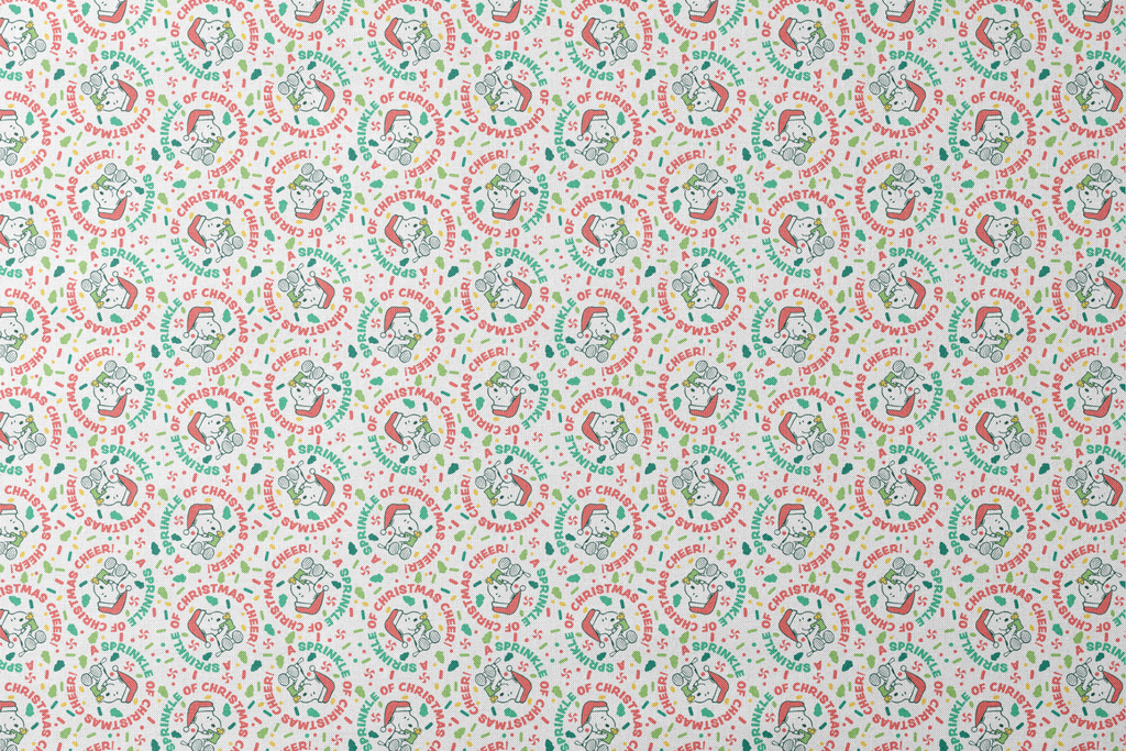 Festive Snoopy Christmas pattern featuring the beloved character in Santa hats, surrounded by sprinkles of cheer, peppermint candies, and holly on a white background.