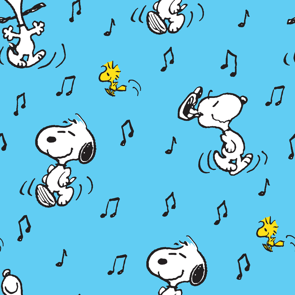 Adorable Snoopy and Woodstock pattern on blue background with musical notes. Perfect for fans of Peanuts characters in a playful, whimsical style.
