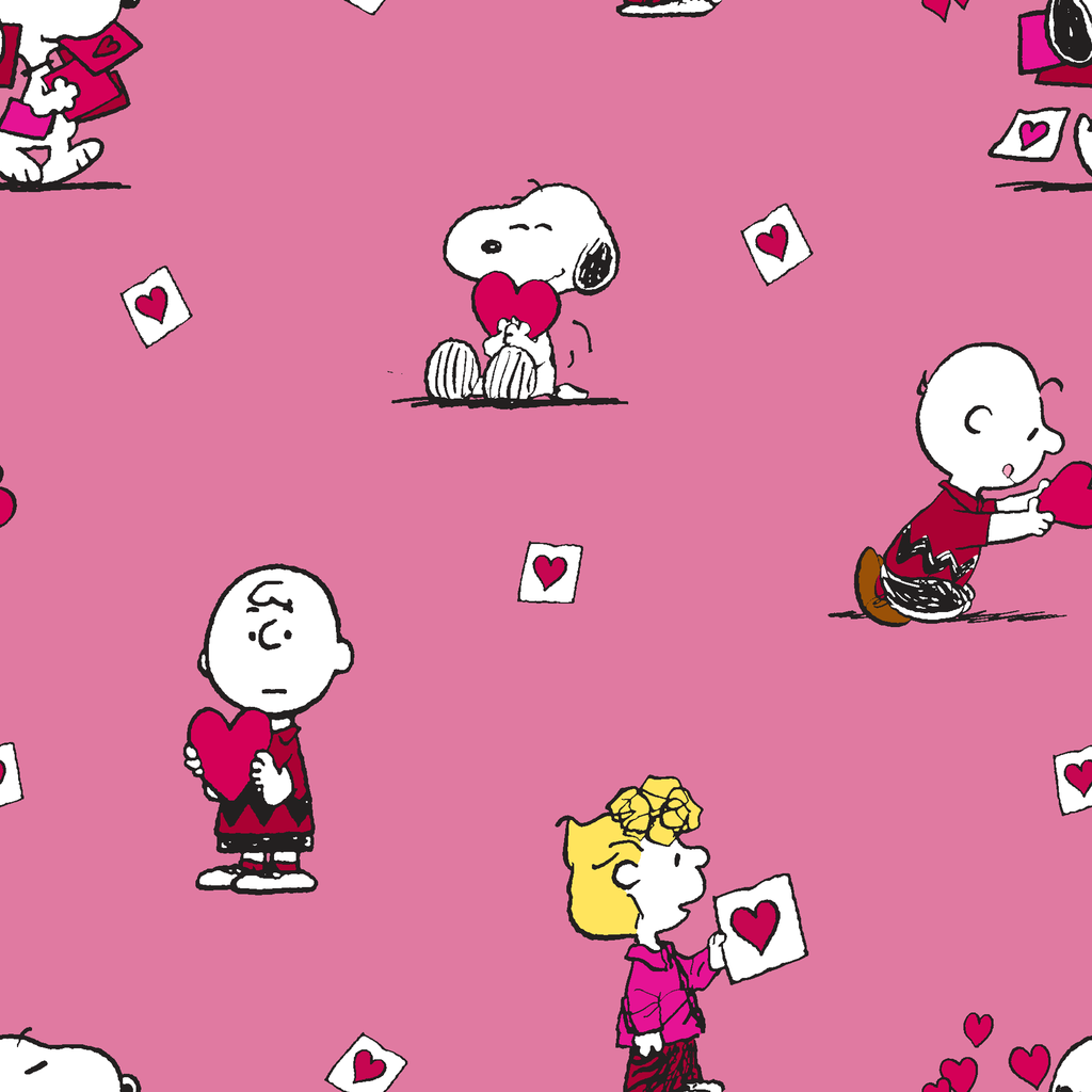 Adorable Peanuts Valentine's Day pattern featuring Snoopy, Charlie Brown, and friends on a pink background with scattered love notes and hearts. Perfect for crafting holiday gifts.