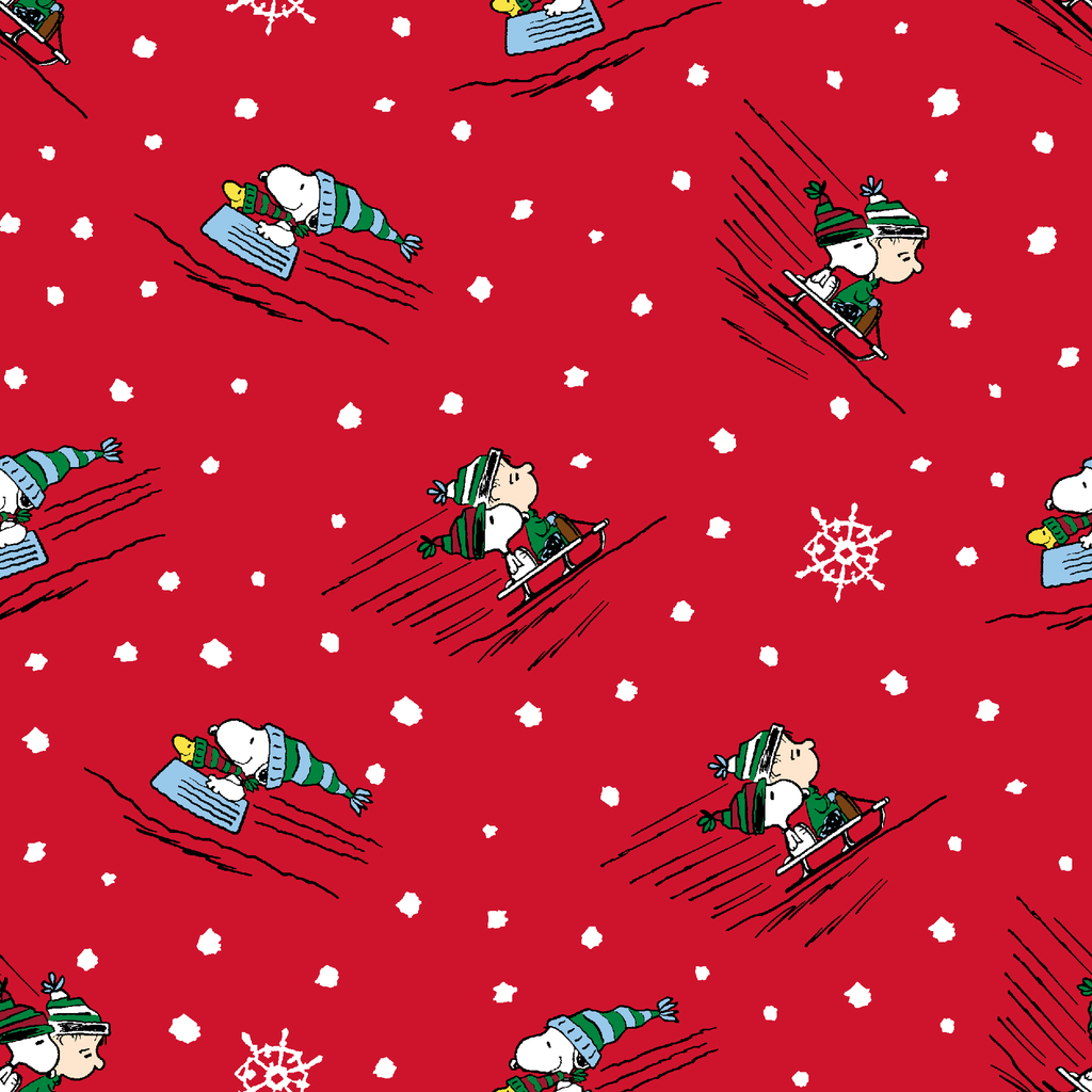 Festive Peanuts Snoopy and friends skiing and sledding amid snowflakes - perfect for holiday crafts, quilting projects, or winter-themed decor.