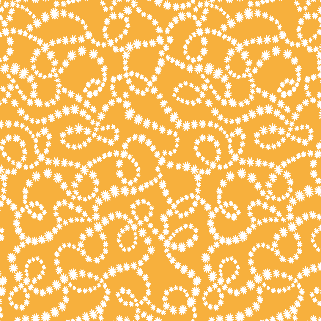 A vibrant mustard background adorned with swirling patterns of small white dots creates a playful retro feel perfect for home decor, apparel, or contemporary interior styling.
