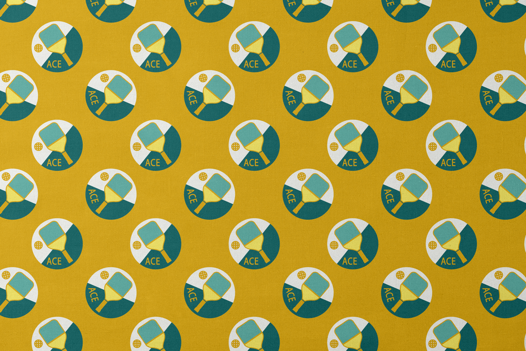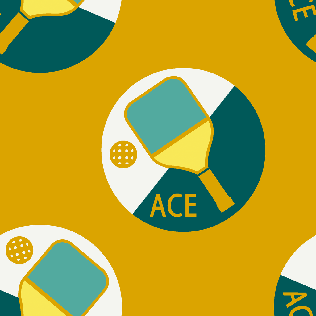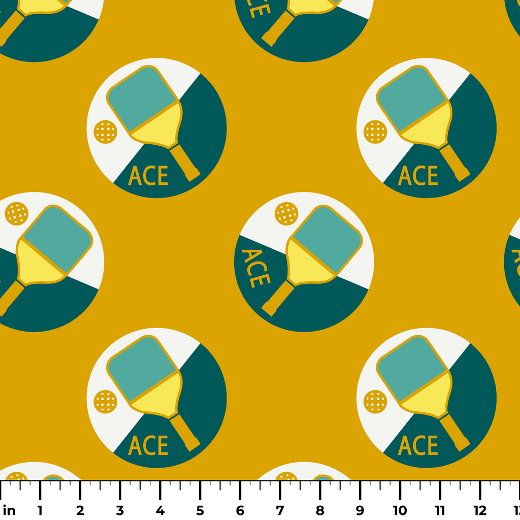 Retro mustard yellow pickleball pattern featuring paddles, balls and "ACE" text in teal and white circles for a vintage athletic aesthetic.