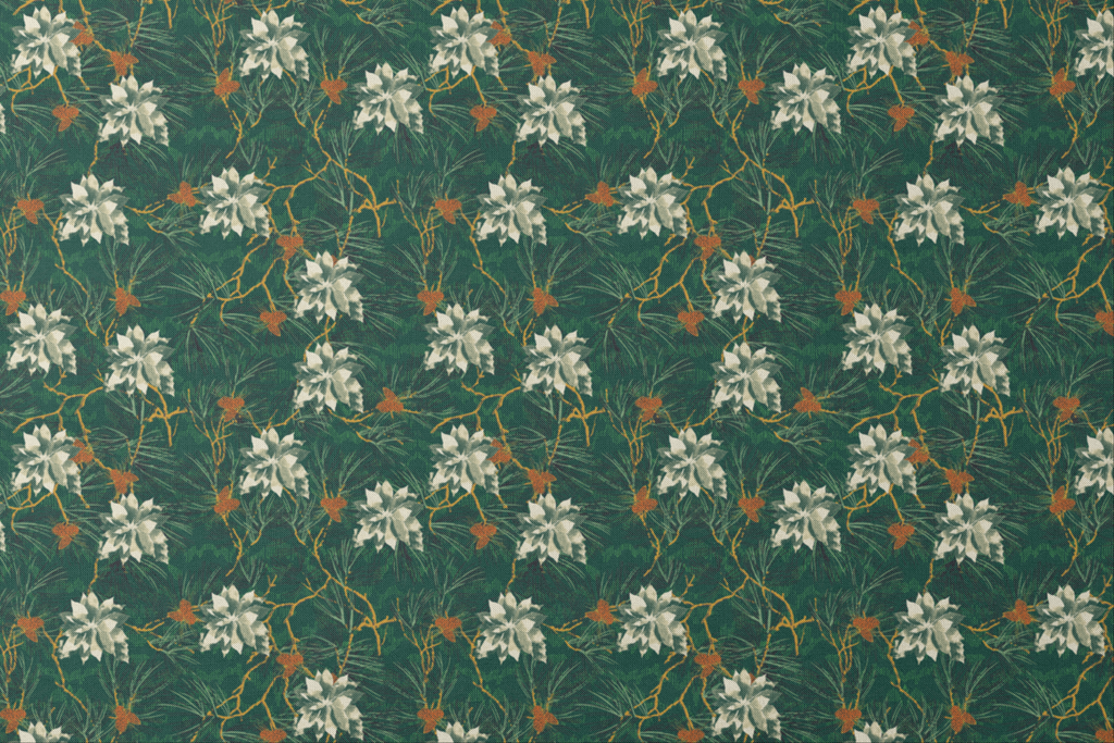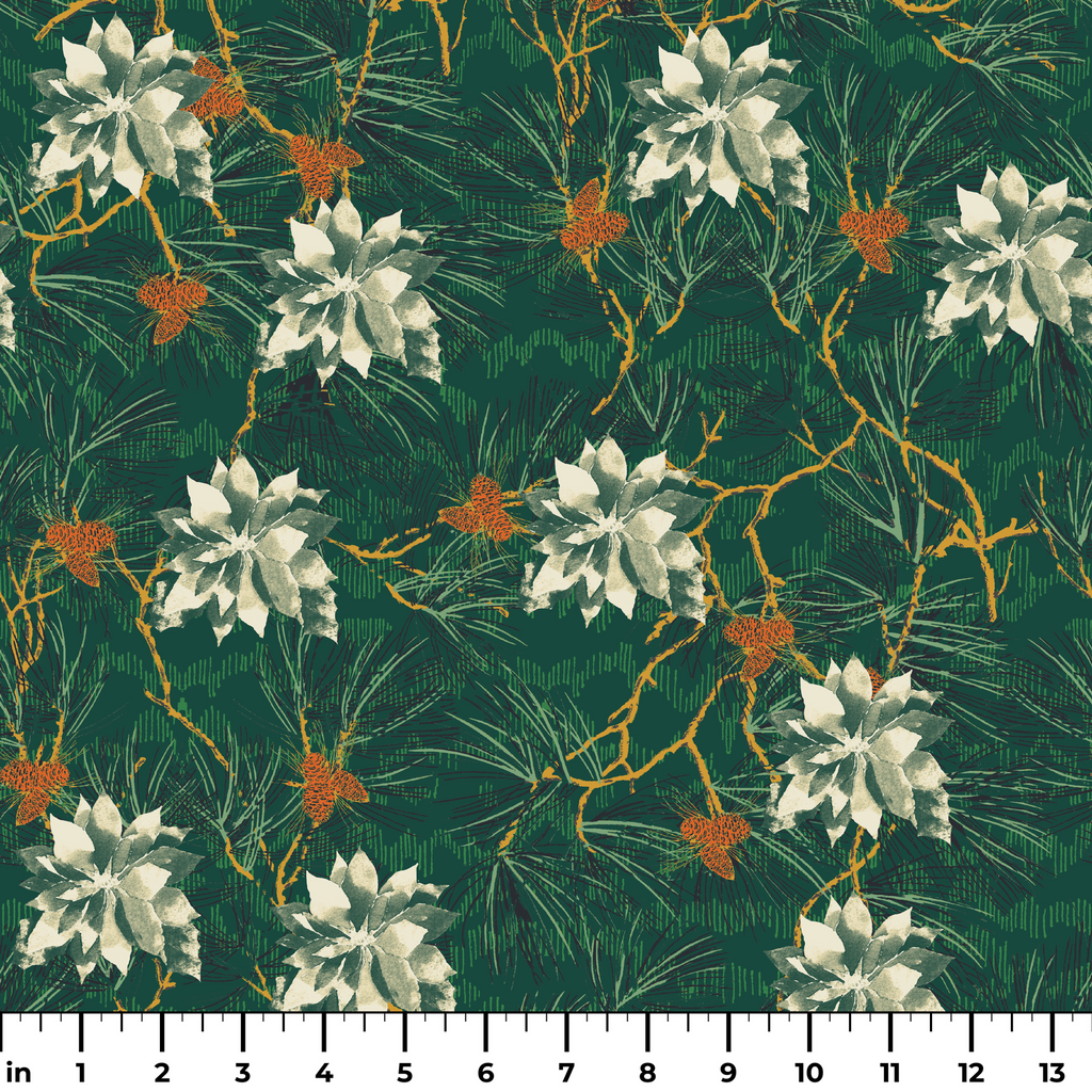 Elegant poinsettia florals on a rich green background with delicate pine needles create a festive holiday pattern perfect for Christmas decor or winter season home accents.