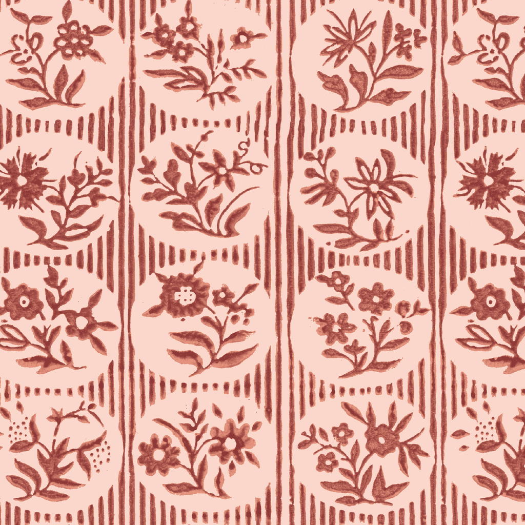 Elegant vintage botanical pattern featuring red floral motifs on cream background with vertical stripes, perfect for traditional home decor or heritage-inspired fashion.