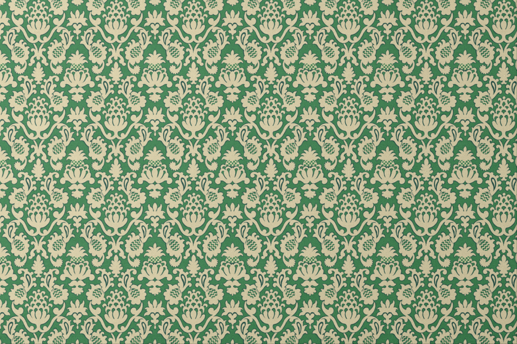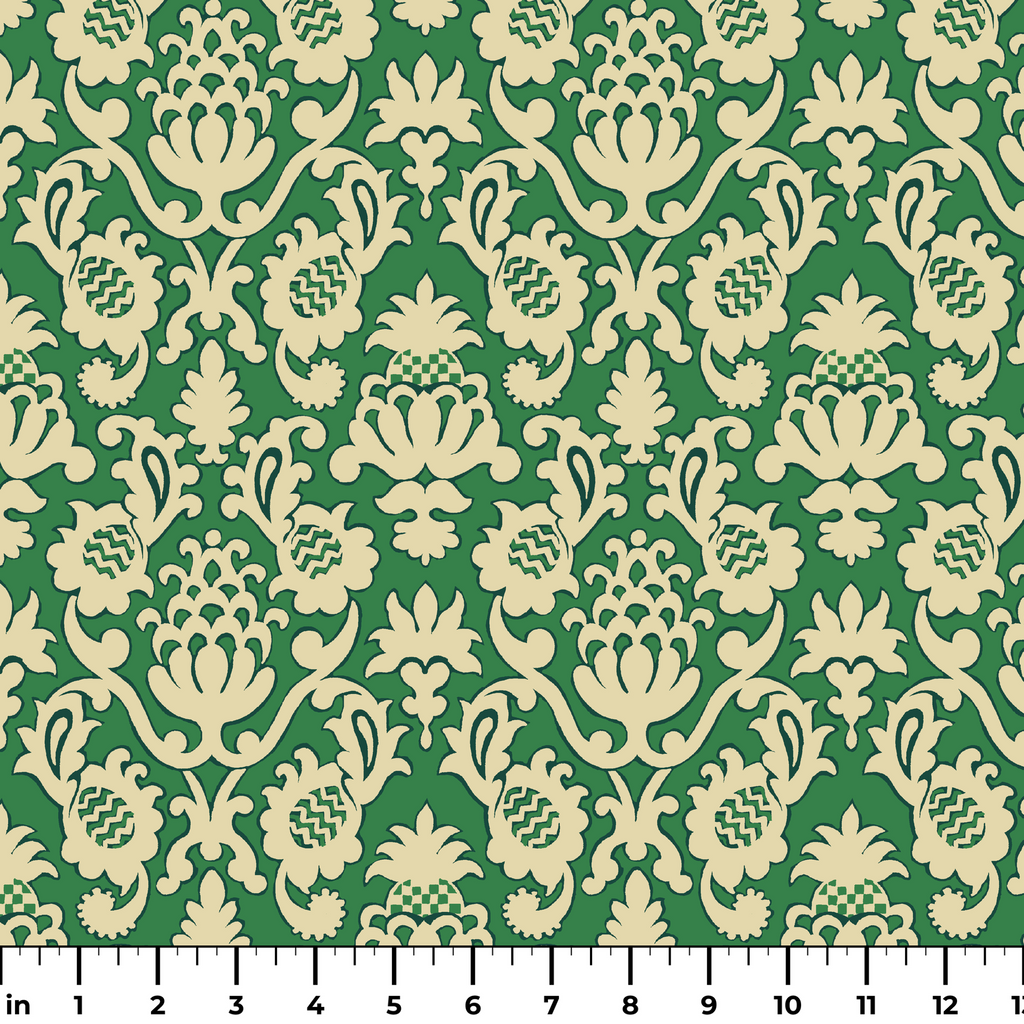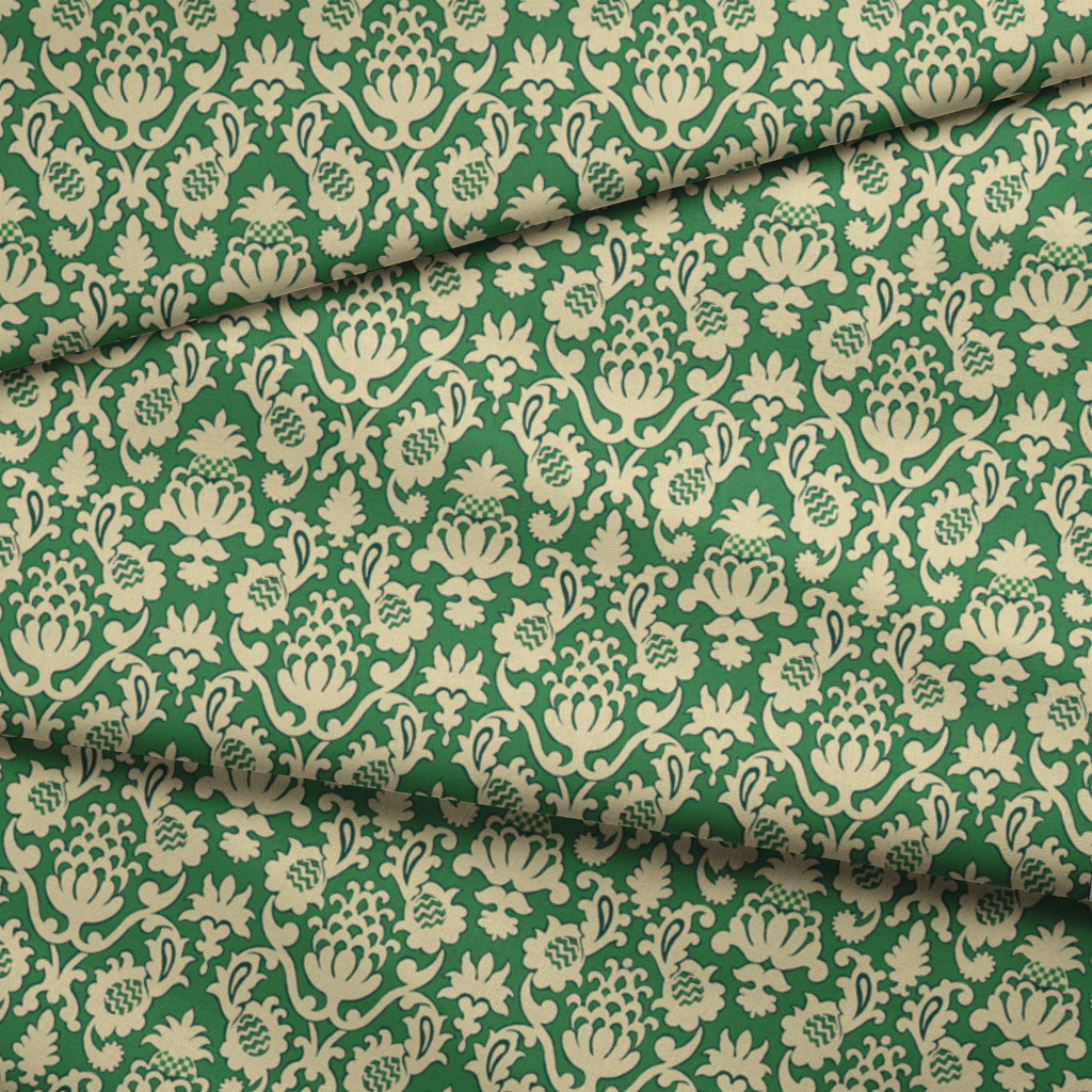 Elegant damask pattern in soft green and cream with floral motifs and ornate scrollwork, perfect for traditional and seasonal home decor and crafting projects.