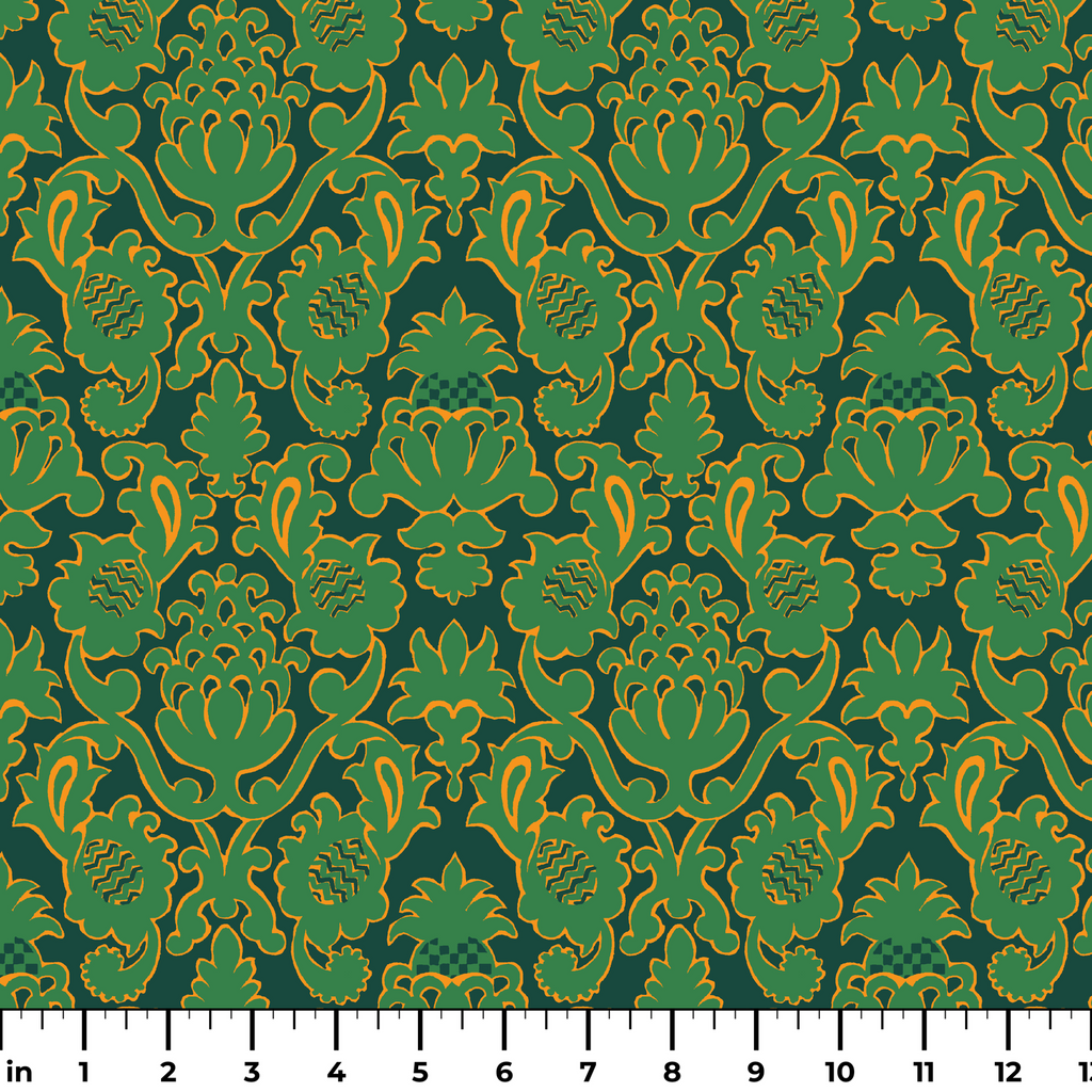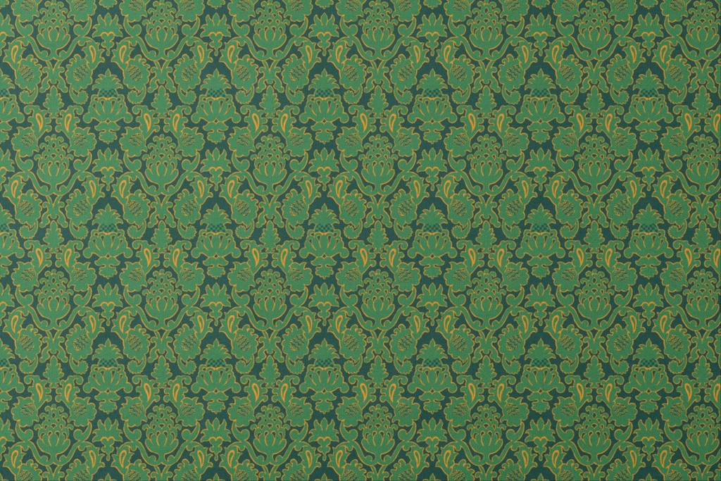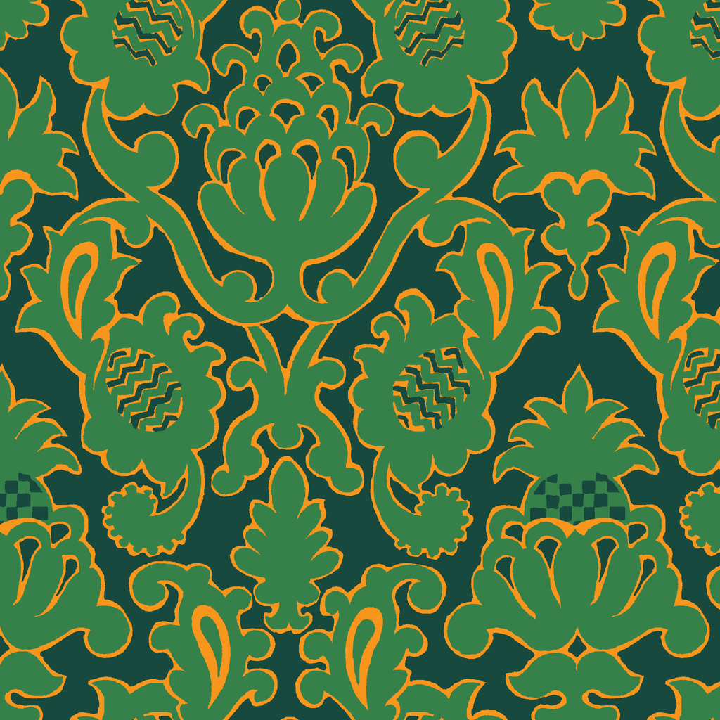 Elegant damask pattern in soft green with floral motifs and ornate scrollwork, perfect for traditional and seasonal home decor and crafting projects.