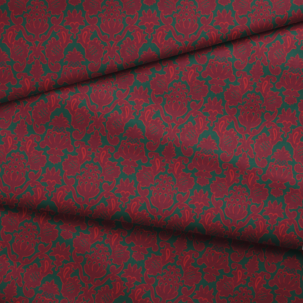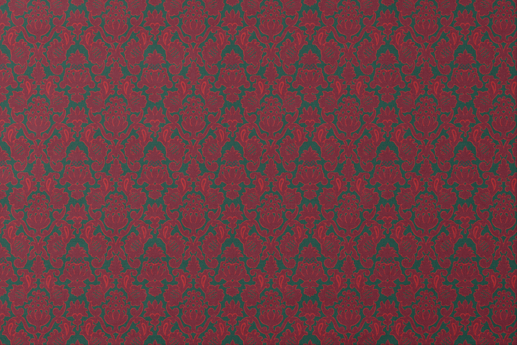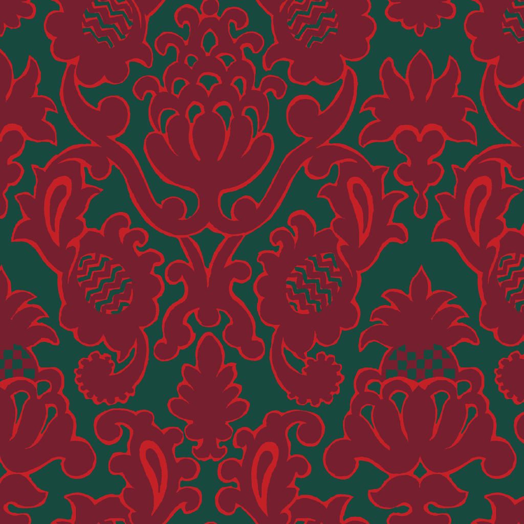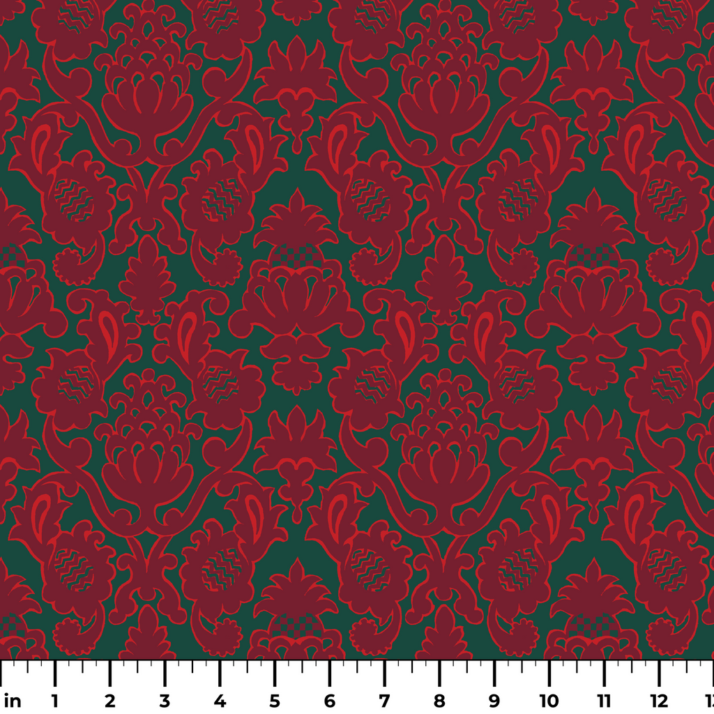 Elegant damask pattern in green and red with floral motifs and ornate scrollwork, perfect for traditional and seasonal home decor and crafting projects.
