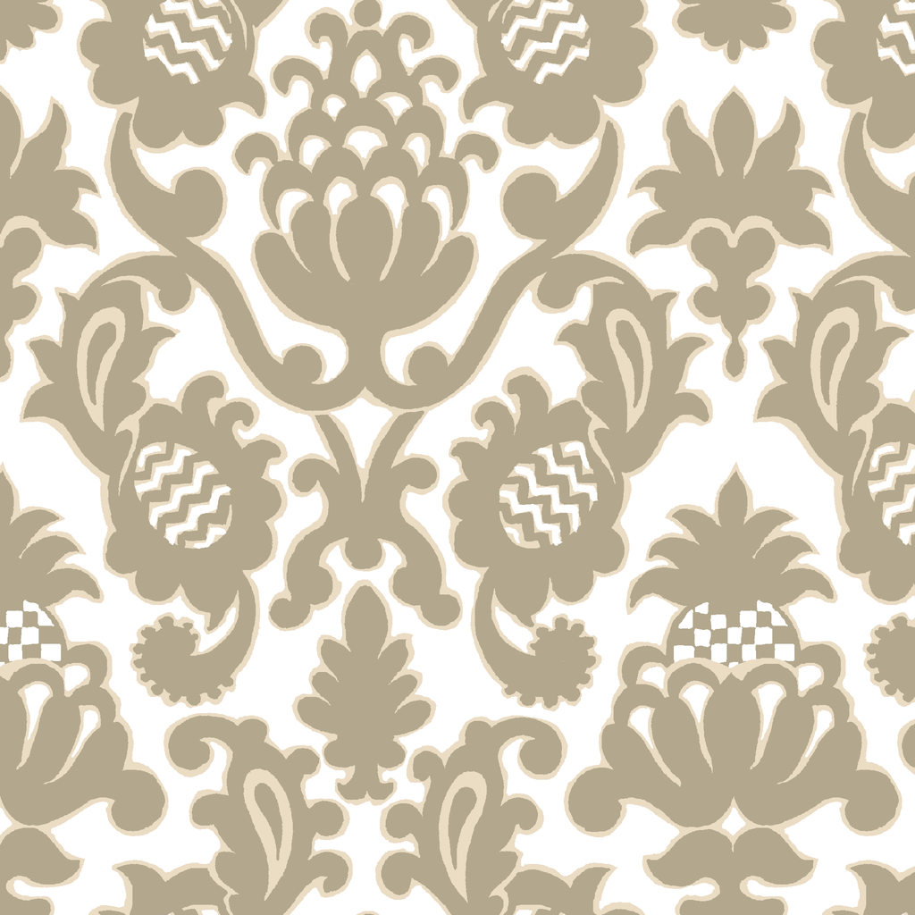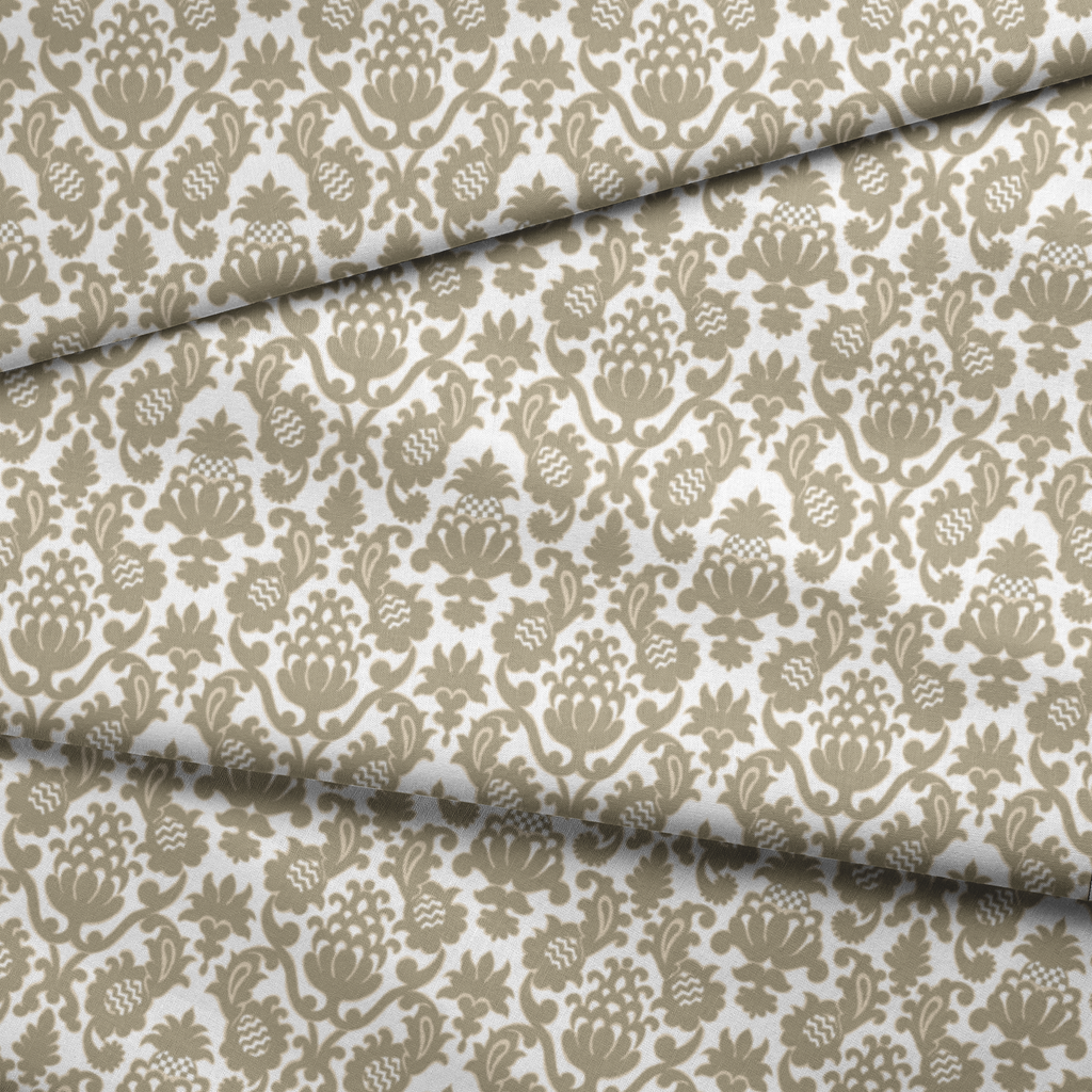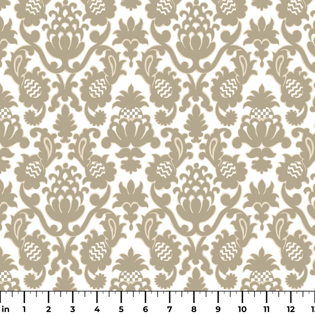 Elegant damask pattern in soft taupe with floral motifs and ornate scrollwork, perfect for traditional and seasonal home decor and crafting projects.