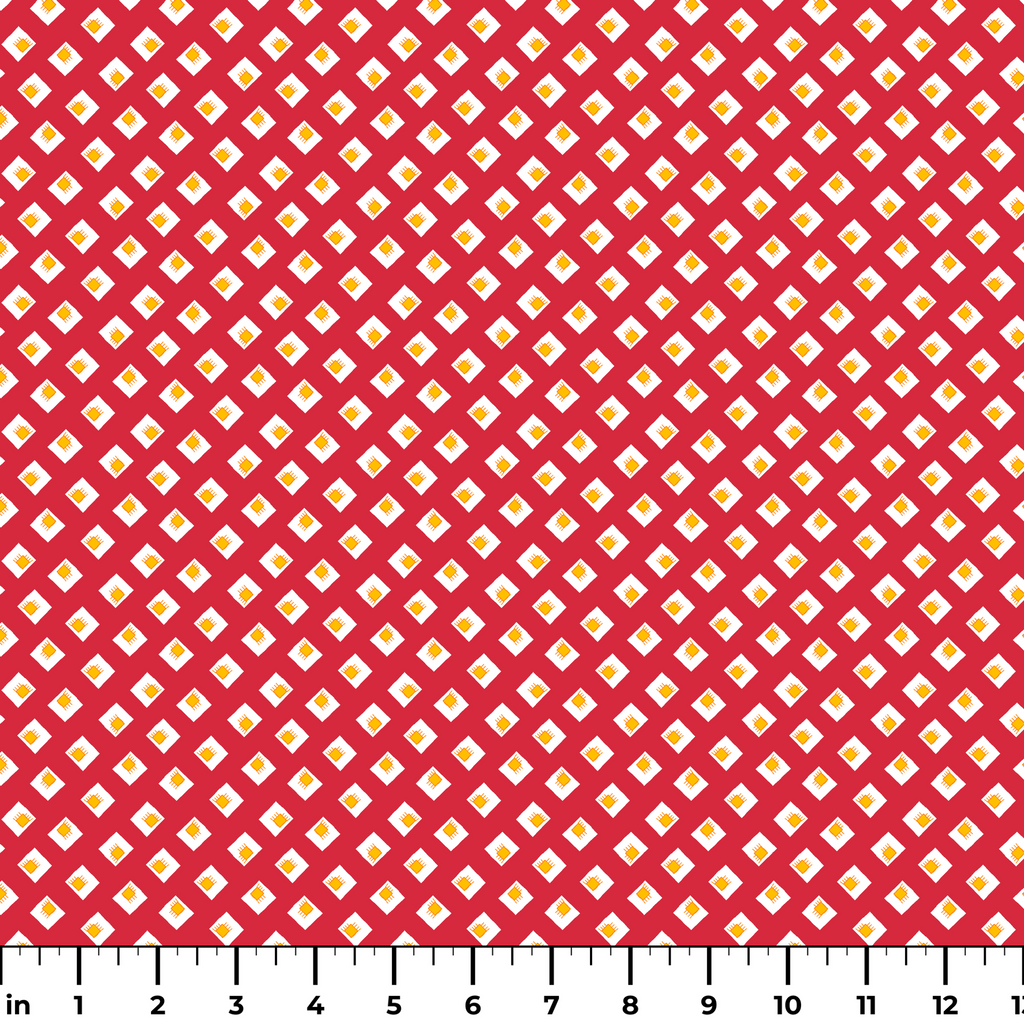 Bold crimson red creates a striking backdrop for this modern geometric pattern featuring white diamond shapes, each containing a sunny yellow square with small radiating lines. The clean lines and vibrant color combination give this fabric a contemporary, almost tech-inspired feel while maintaining playful warmth. Perfect for statement quilting projects or eye-catching accent pillows that add a pop of color to neutral spaces.