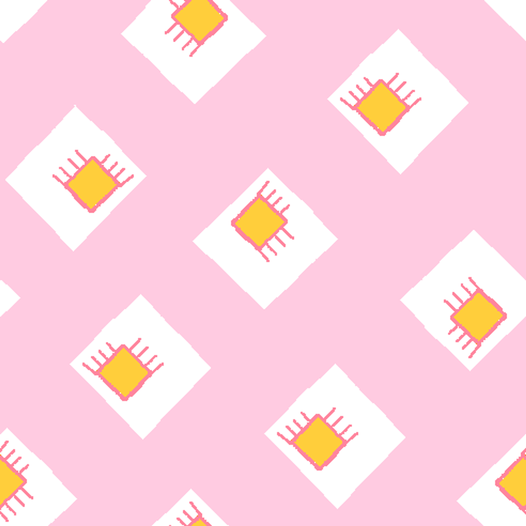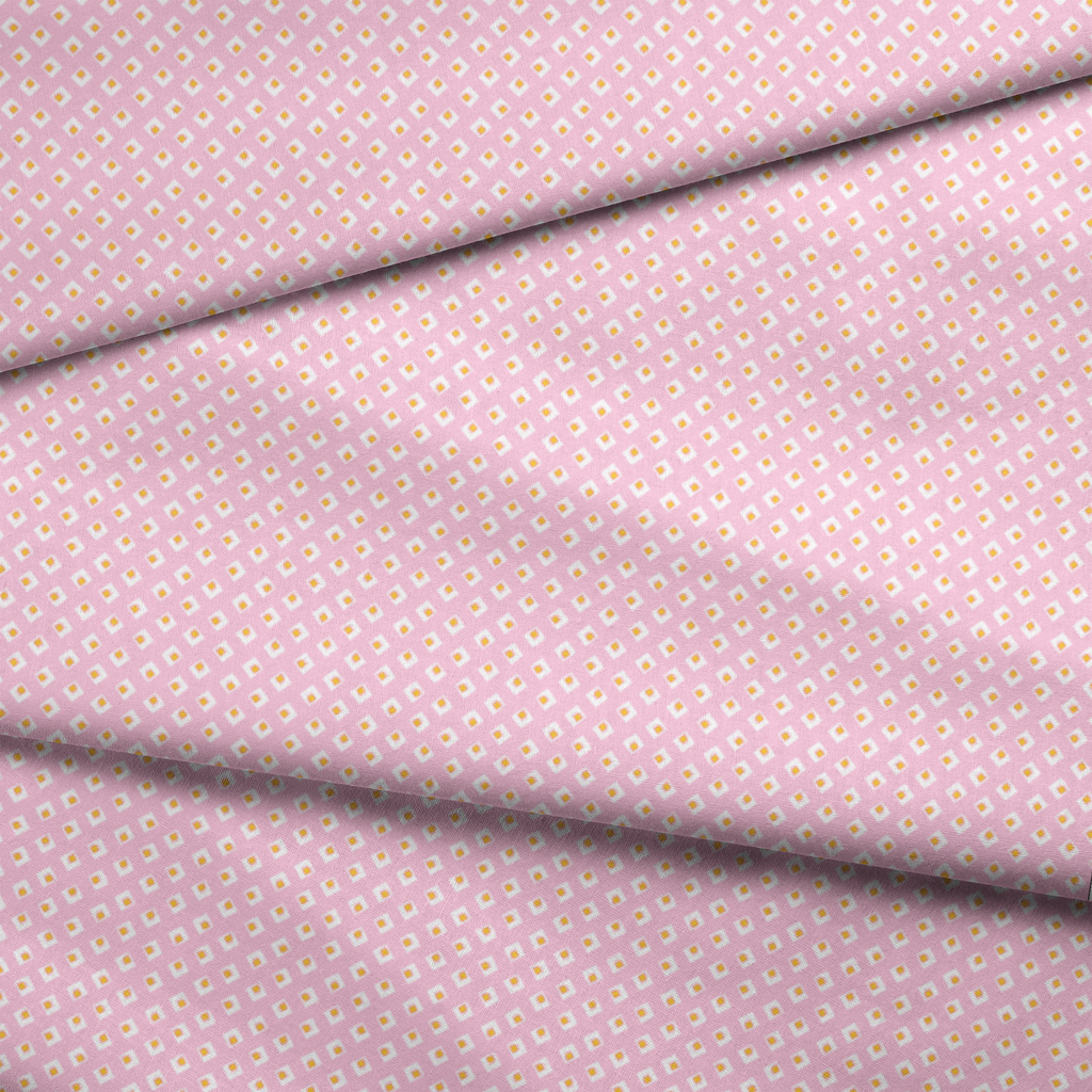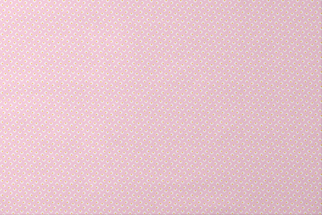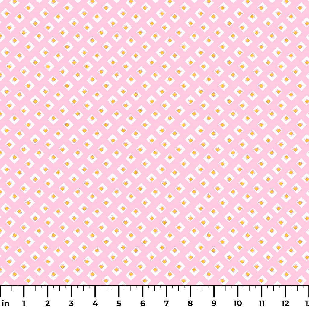 Playful yellow squares with tiny radiating lines sit within diamond-shaped white tiles, scattered across a soft pink background in this modern geometric pattern. The cheerful color combination creates a whimsical yet contemporary feel, perfect for adding a touch of fun to any sewing project. This fabric would make adorable nursery accessories or lively tote bags that catch the eye.