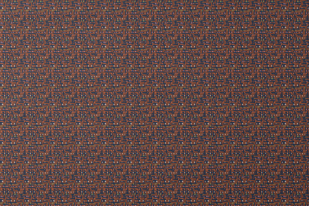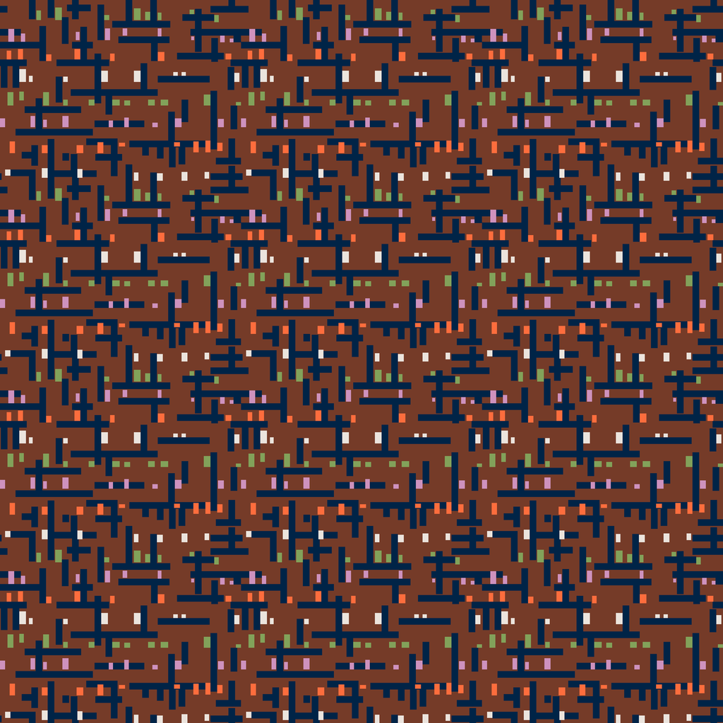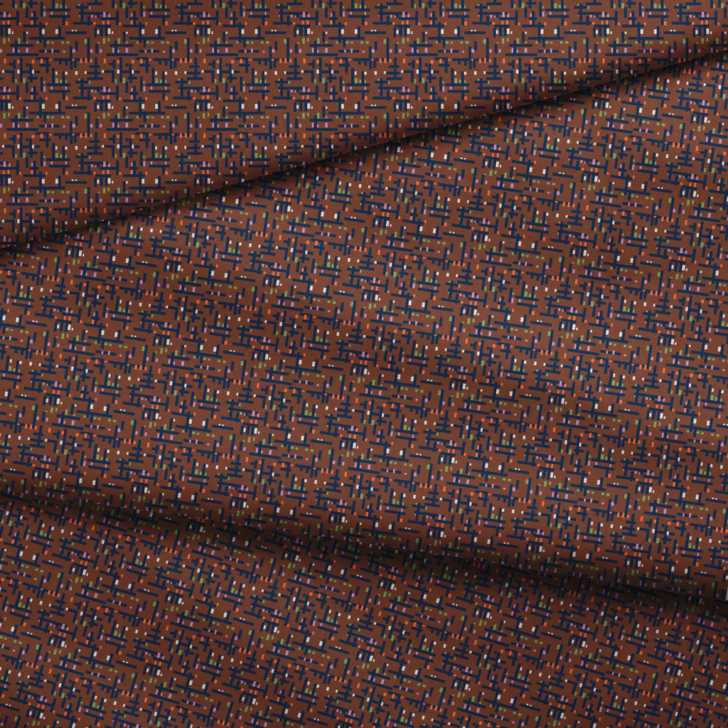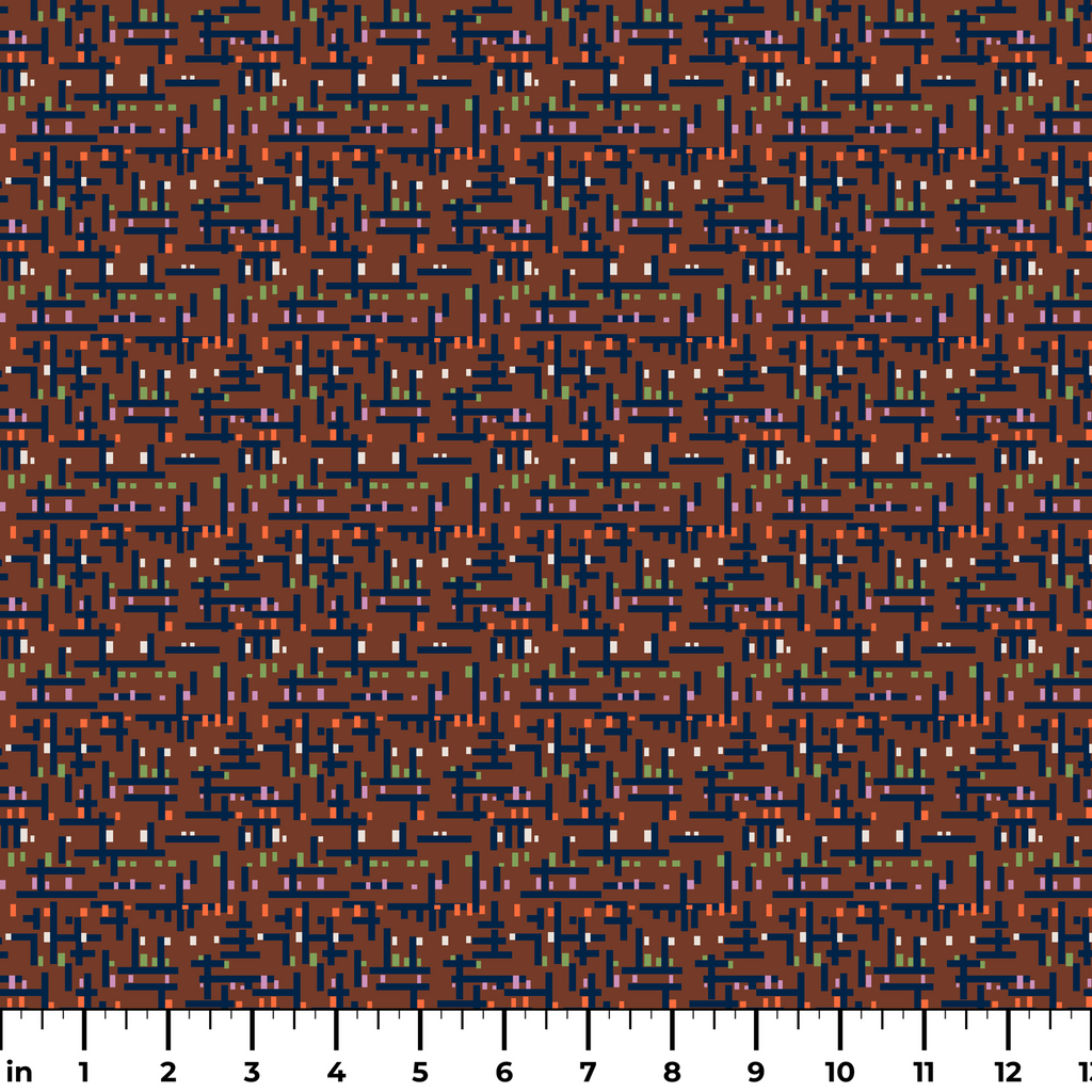 A contemporary geometric maze pattern in rich earthy tones of rust brown, navy blue, and accents of white, perfect for modern home decor or upholstery projects.