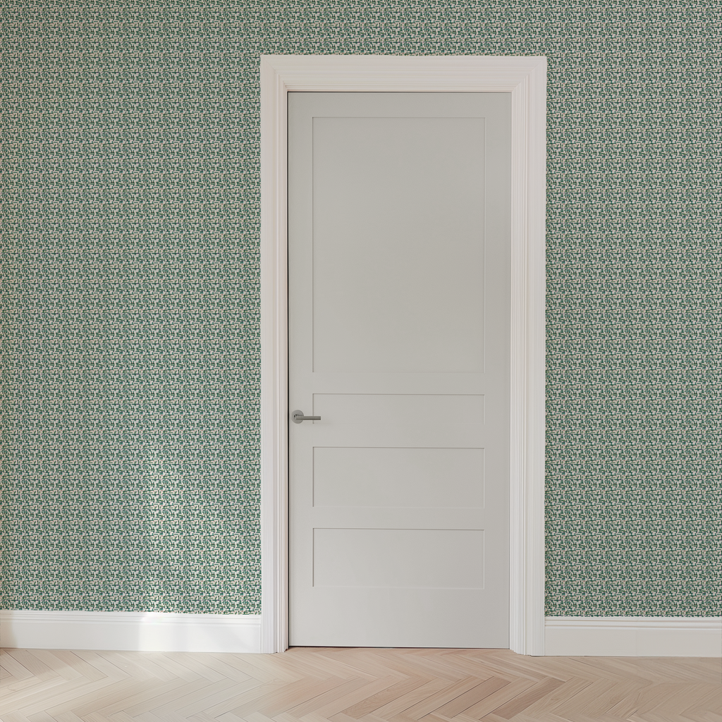 Abstract geometric pattern featuring dark green lines arranged in a maze-like design on a cream background. Perfect for modern spaces with a vintage twist.