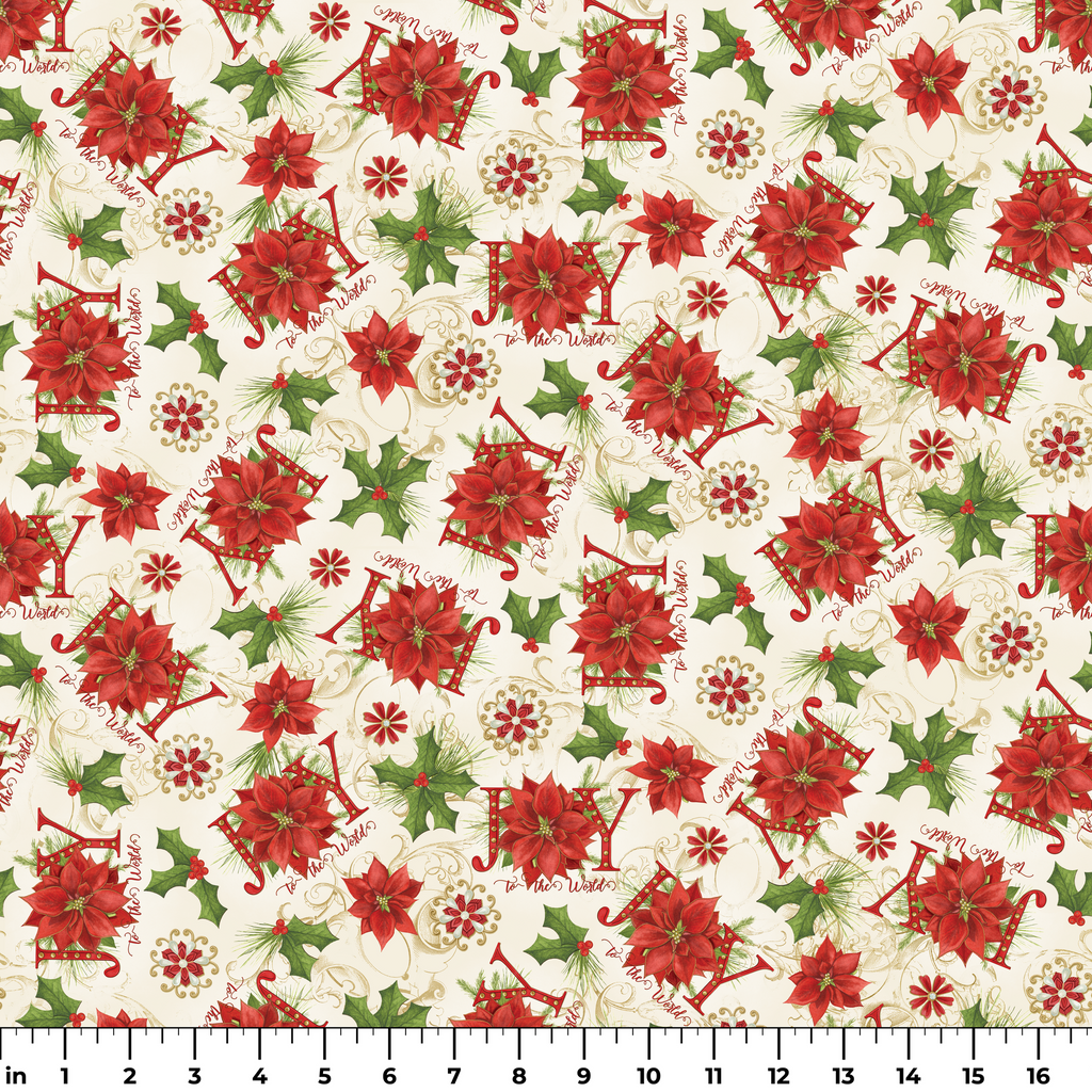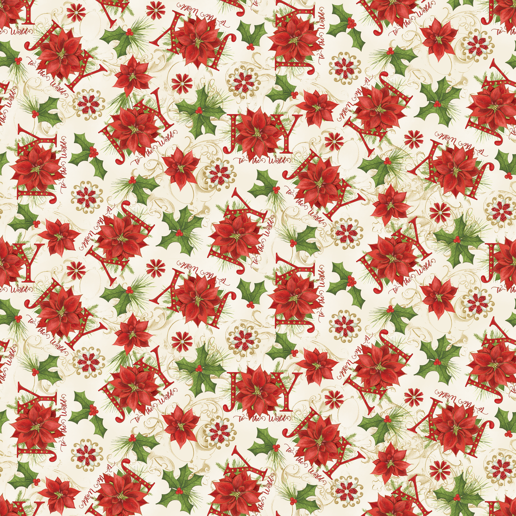 Festive red poinsettias, holly leaves, and cheerful “Joy” lettering in a vintage holiday toss by Nicole Tamarin. This fabric design is perfect for your next holiday quilt design or DIY decor project.