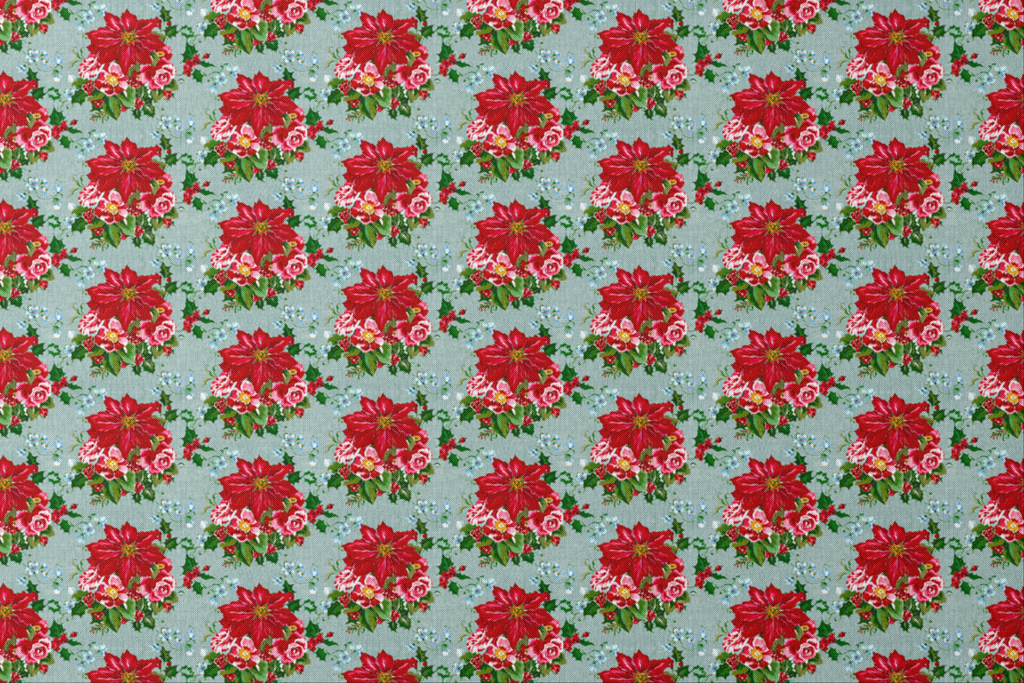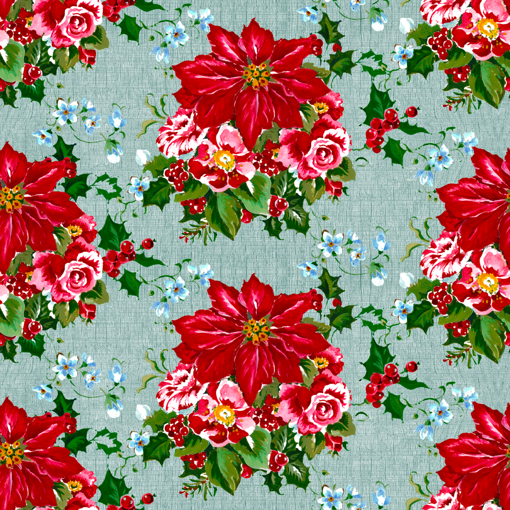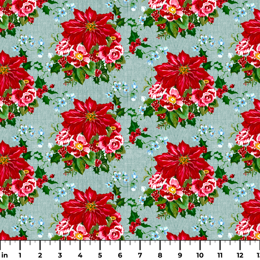 Vibrant red poinsettias with festive greenery create a traditional Christmas floral pattern on a soft sage green background, perfect for holiday home decor and quilting projects.