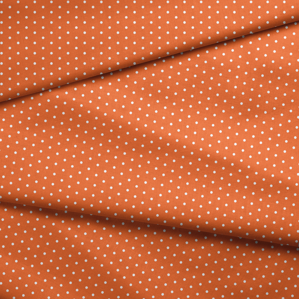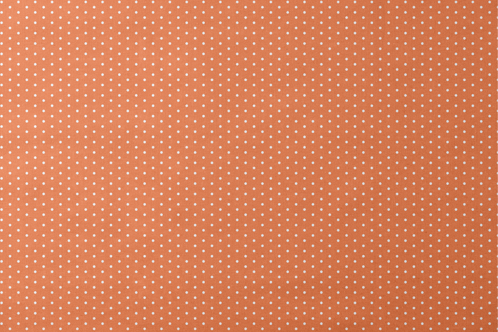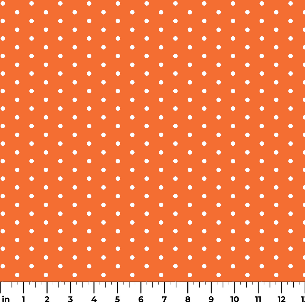 Vibrant orange background with white minimalist polka dots. The contemporary design features geometric shapes in a sophisticated color palette ideal for sewing modern home decor or nursery apparel.