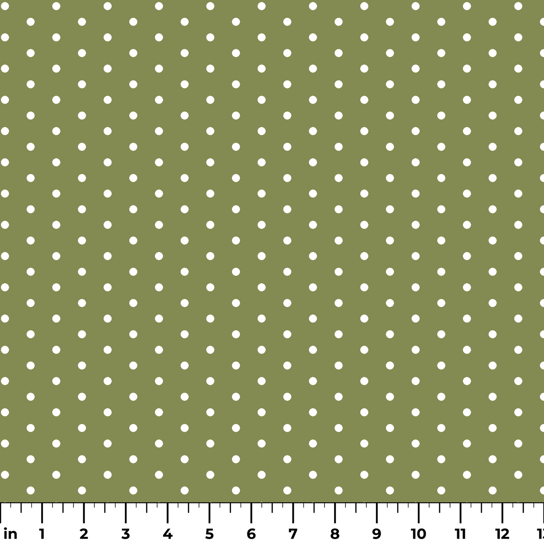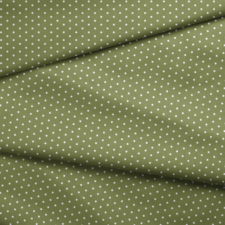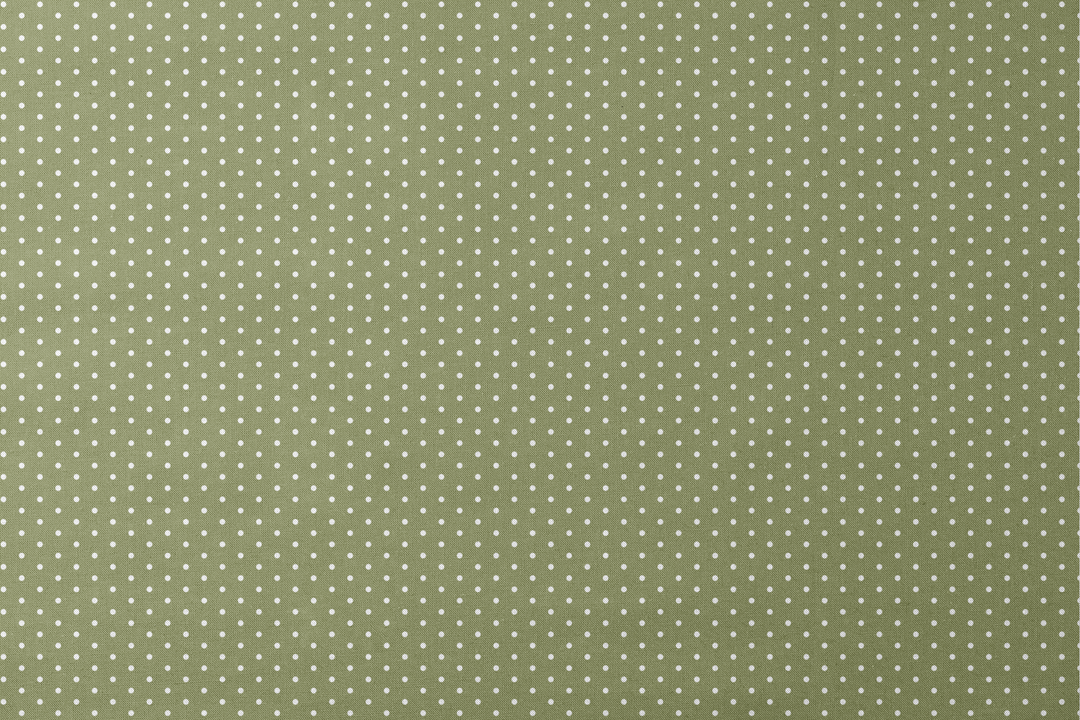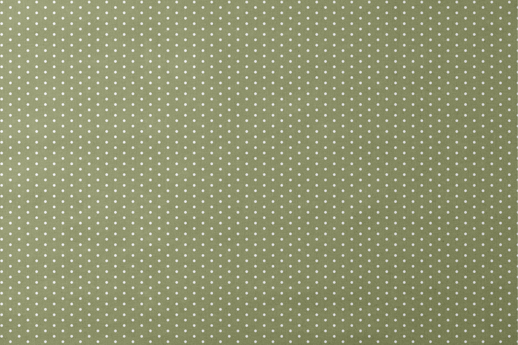 Olive green background with white minimalist polka dots. The contemporary design features geometric shapes in a sophisticated color palette ideal for sewing modern home decor or nursery apparel.