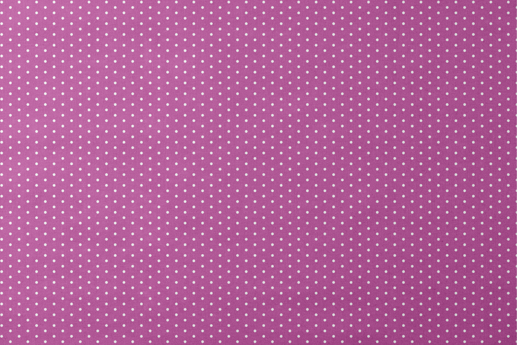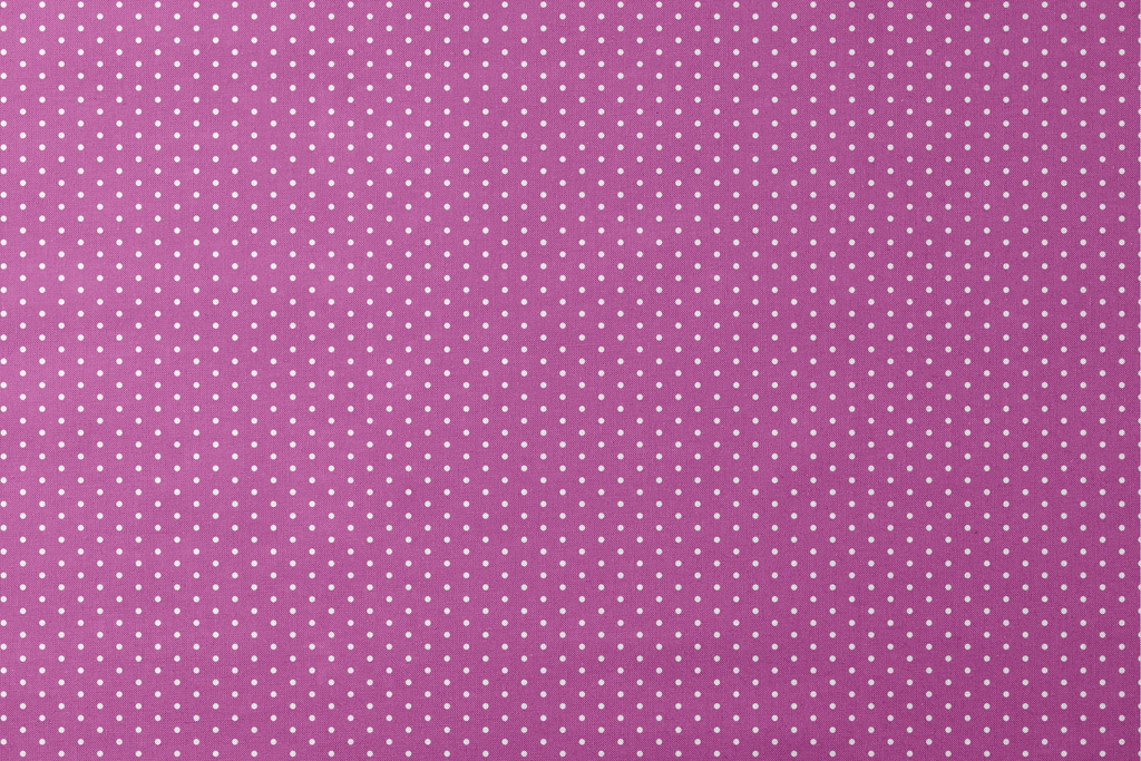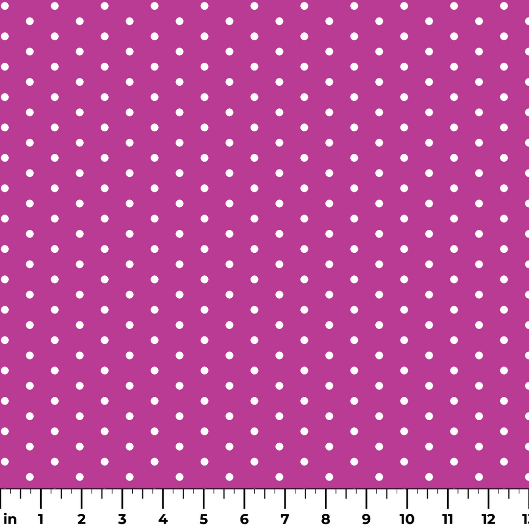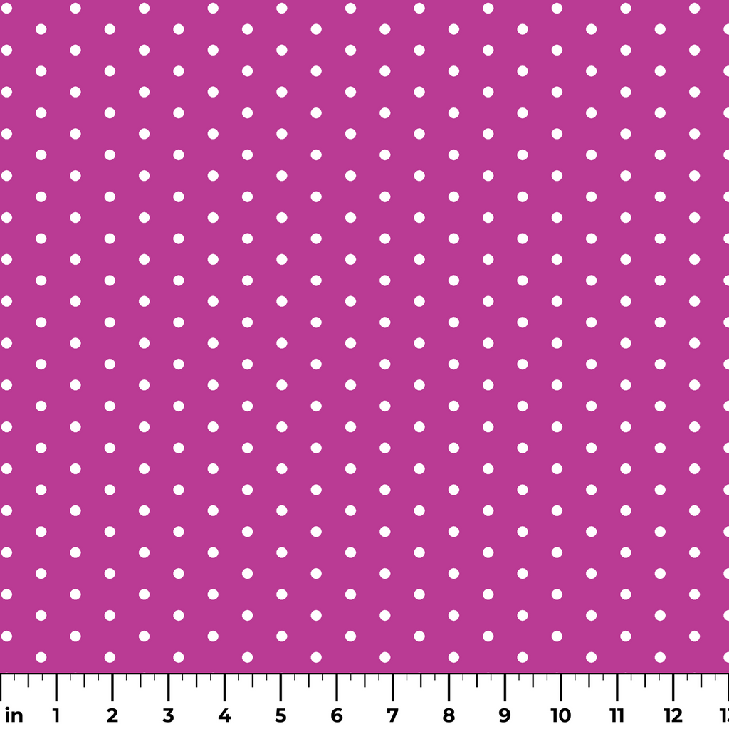 Vibrant purple background with white minimalist polka dots. The contemporary design features geometric shapes in a sophisticated color palette ideal for sewing modern home decor or nursery apparel.