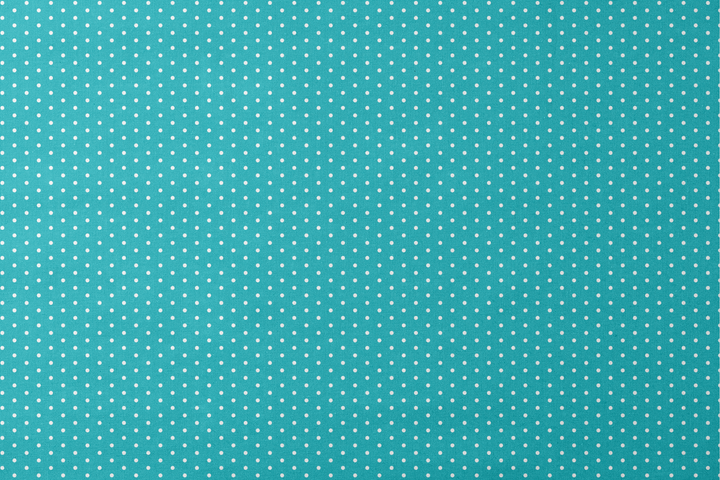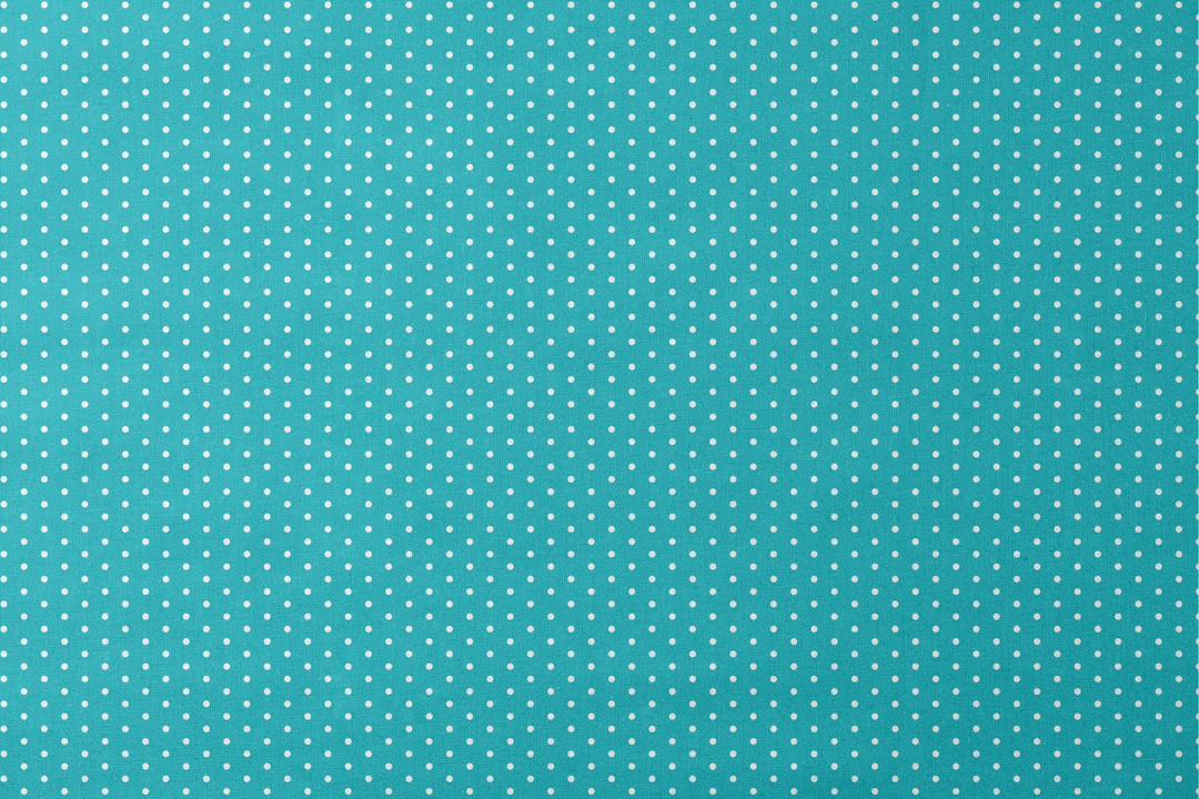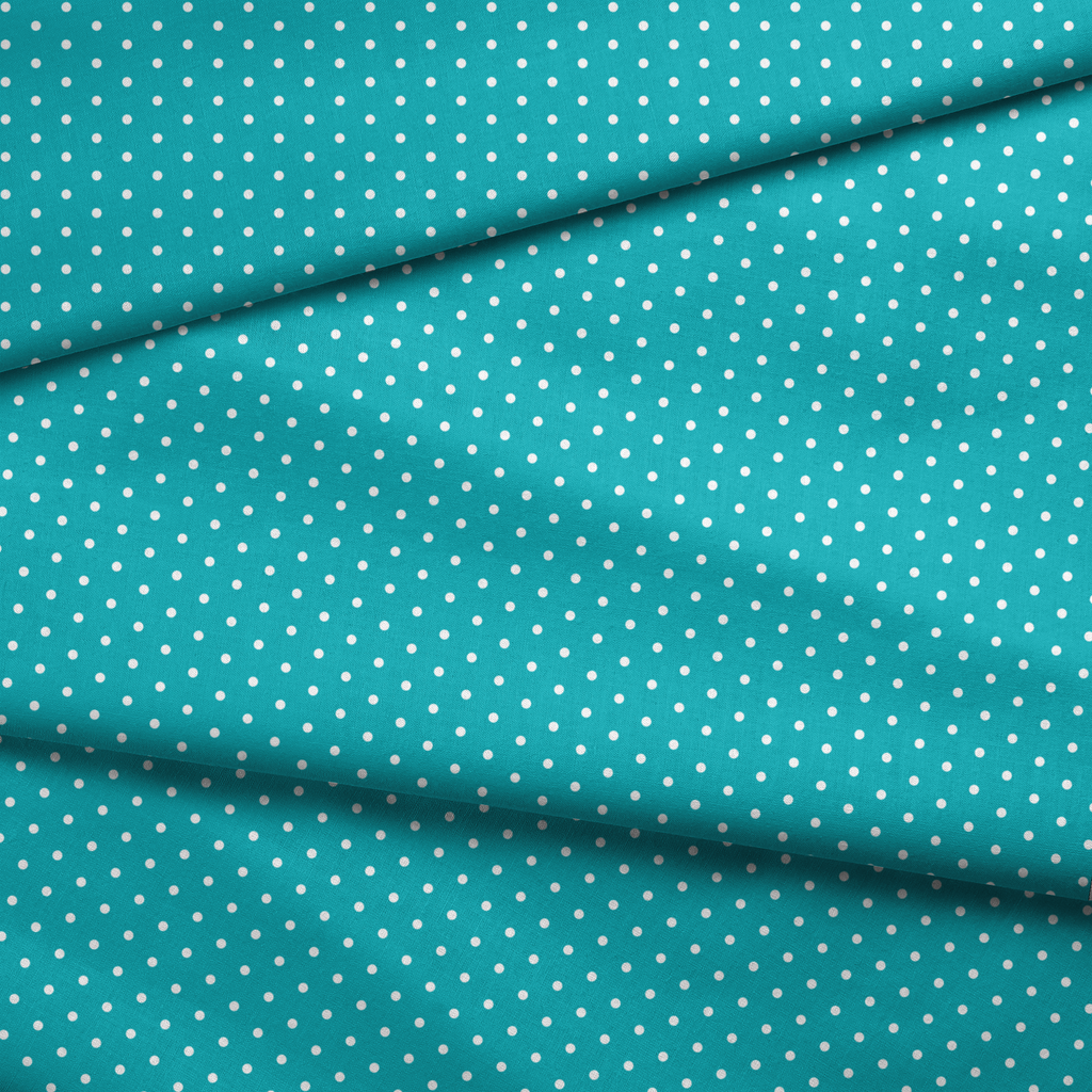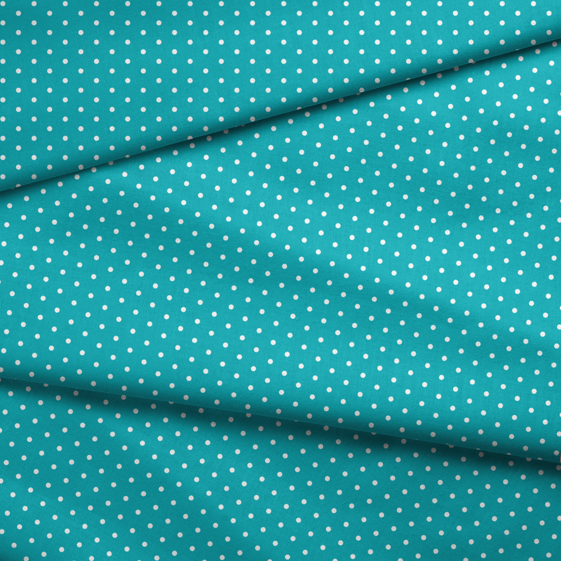 Vibrant turquoise background with white minimalist polka dots. The contemporary design features geometric shapes in a sophisticated color palette ideal for sewing modern home decor or nursery apparel.