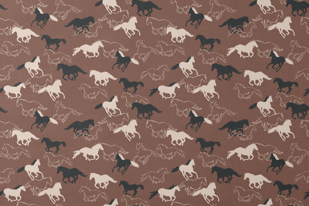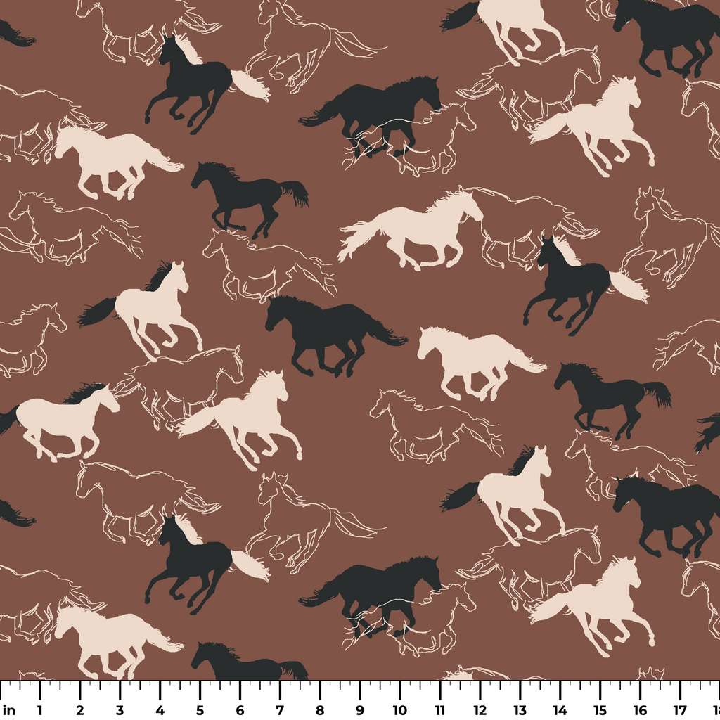 Dynamic equestrian pattern featuring galloping horses in black, white, and outline silhouettes against a rich brown background, perfect for western-themed home decor or apparel.
