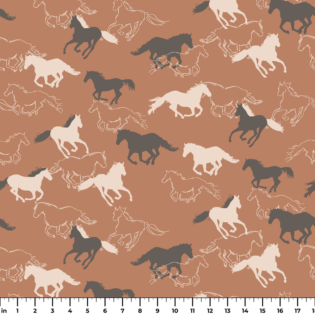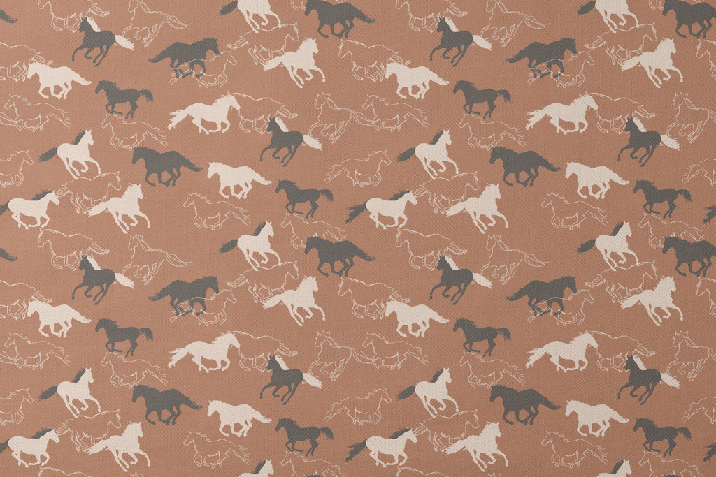 Elegant galloping horses pattern in brown, white, and gray tones creates a rustic equestrian motif perfect for home decor or apparel with a classic western aesthetic.