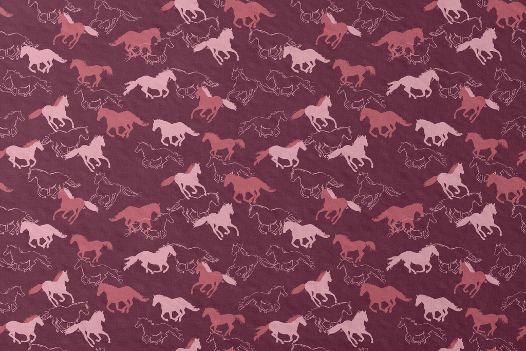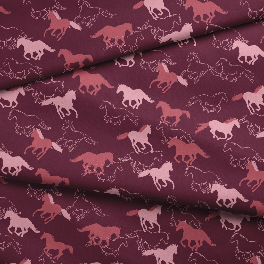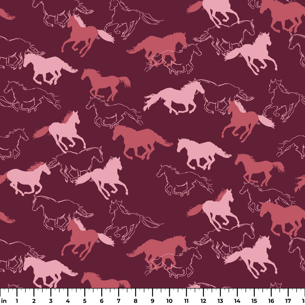 Dynamic equestrian pattern featuring galloping horses in various pink and burgundy shades on a rich maroon background—perfect for western-themed home decor or apparel.