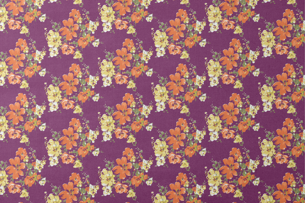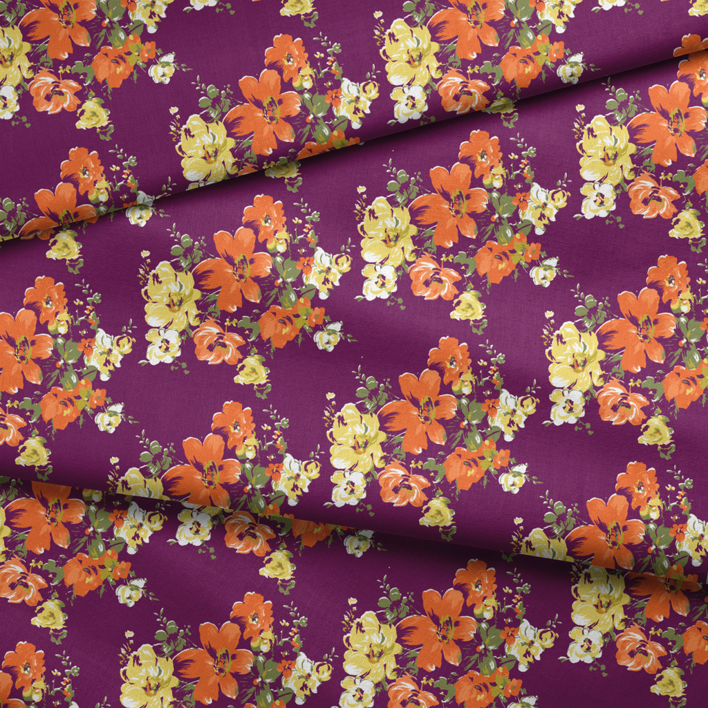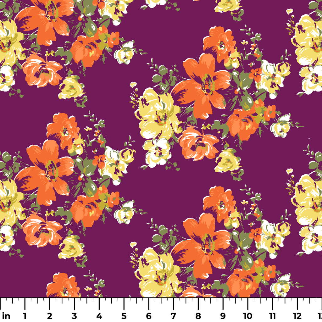 Vibrant orange and yellow florals bloom against a rich purple background in this elegant botanical pattern, perfect for sewing home decor and apparel.