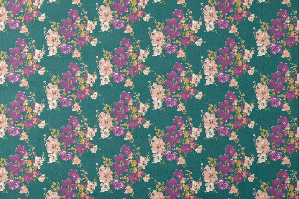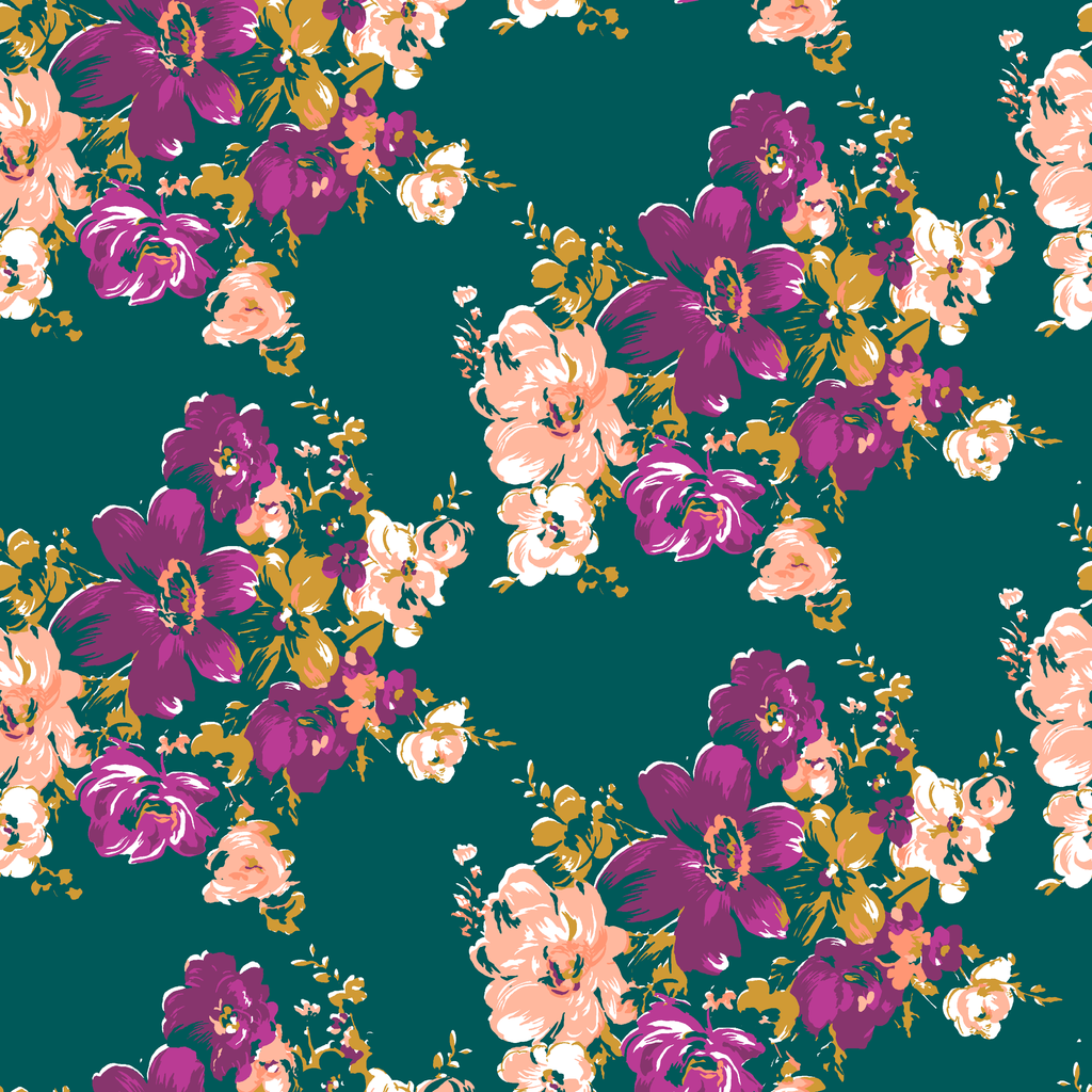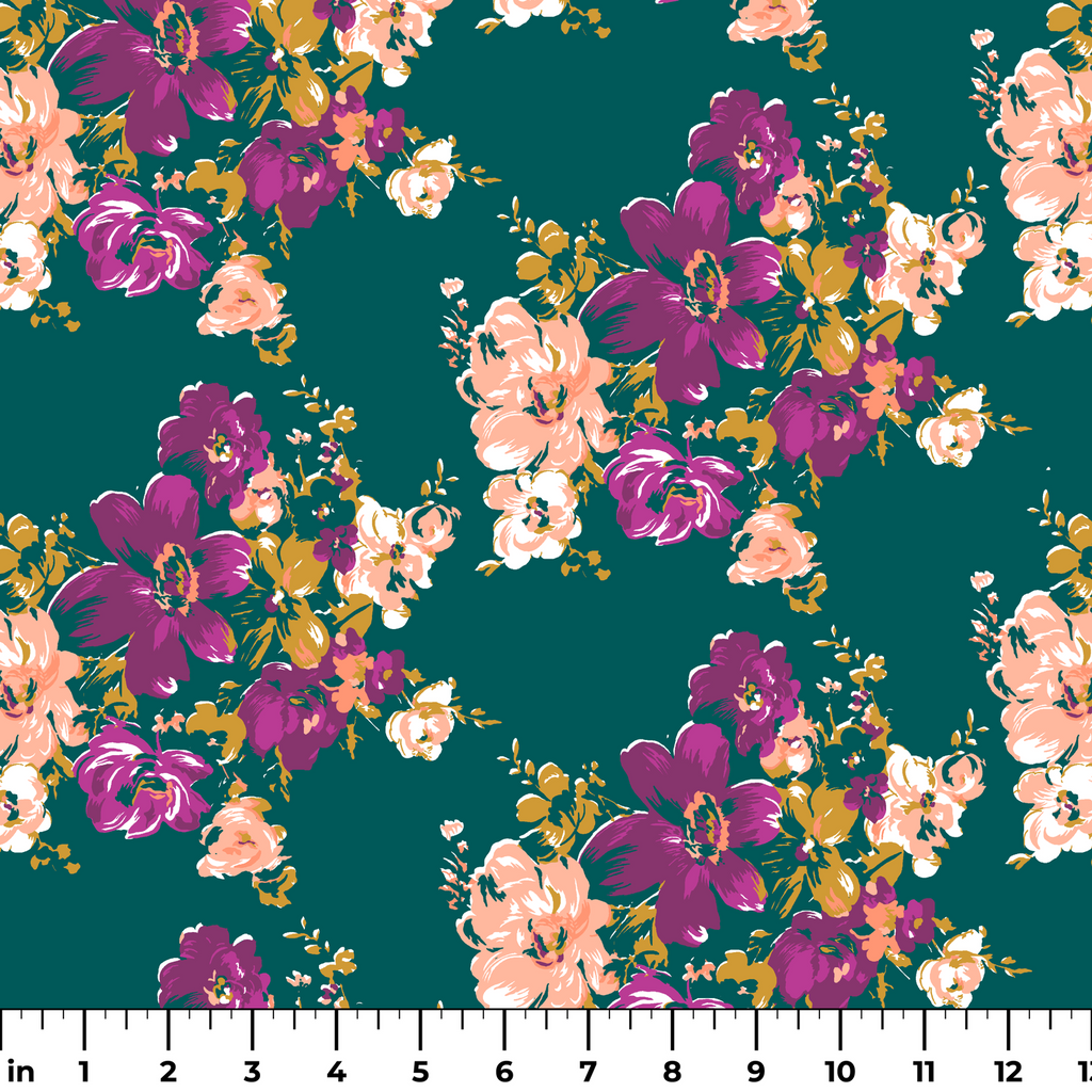 Vibrant purple and peach florals bloom against a rich teal background in this elegant botanical pattern, perfect for sewing home decor and apparel.