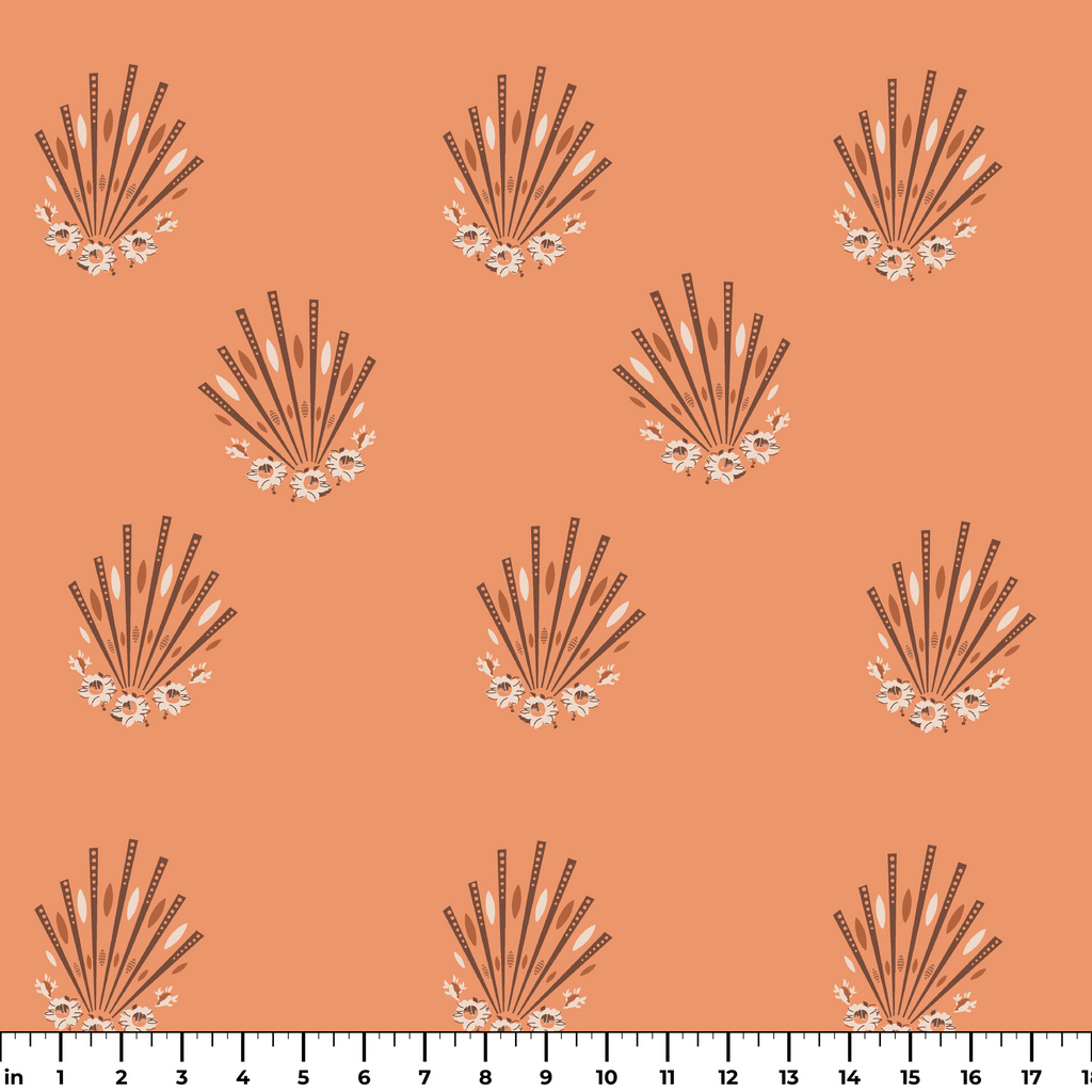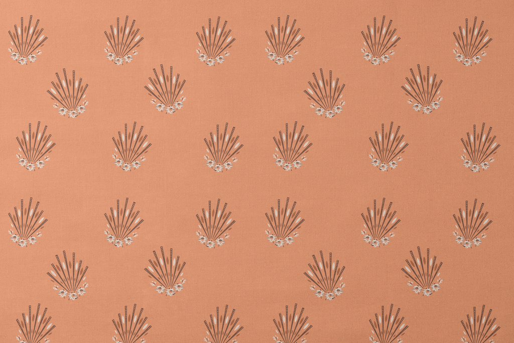 Delicate fan-shaped florals in warm terracotta create a vintage bohemian pattern. White blossoms and slender stems form elegant radiating motifs for a sophisticated, nature-inspired textile design.
