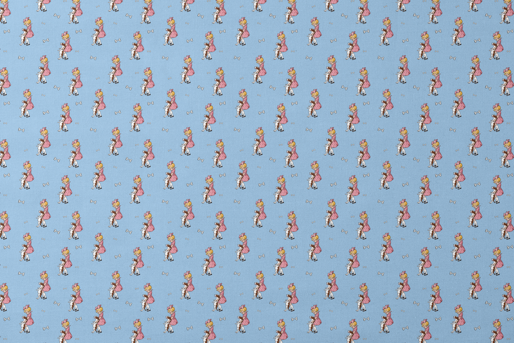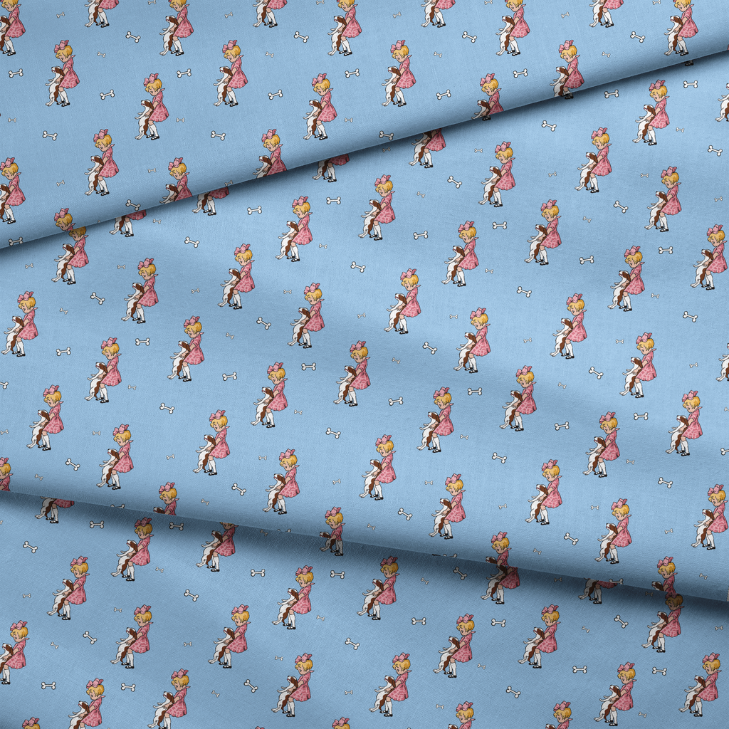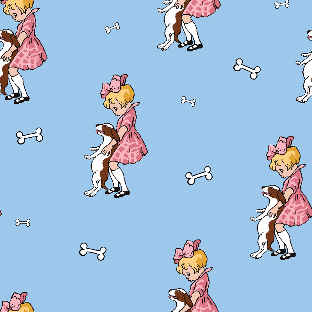 Adorable pattern featuring a little girl in pink dress hugging pups, with cute bone motifs scattered on a light blue background. Perfect for children's crafts or nursery decor.