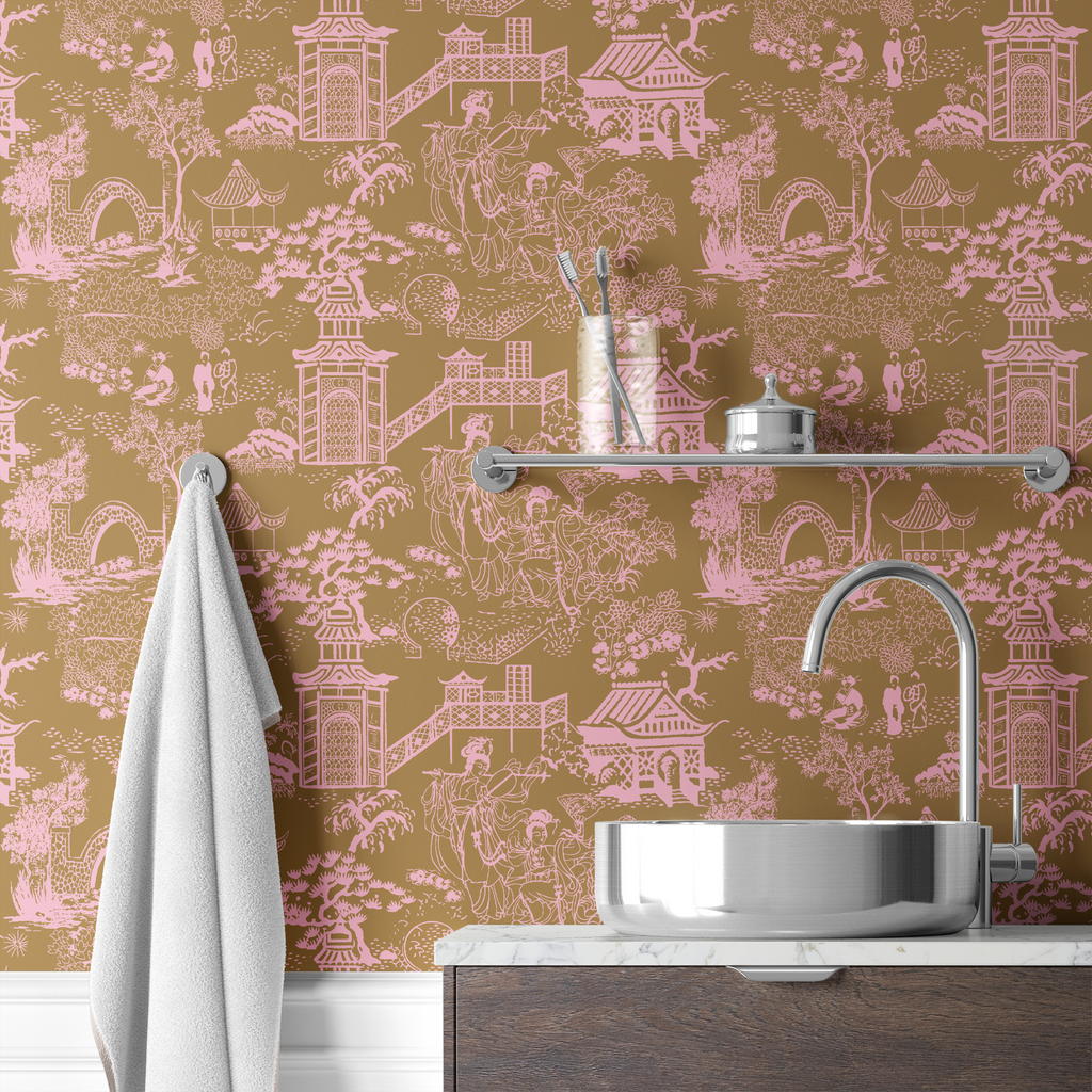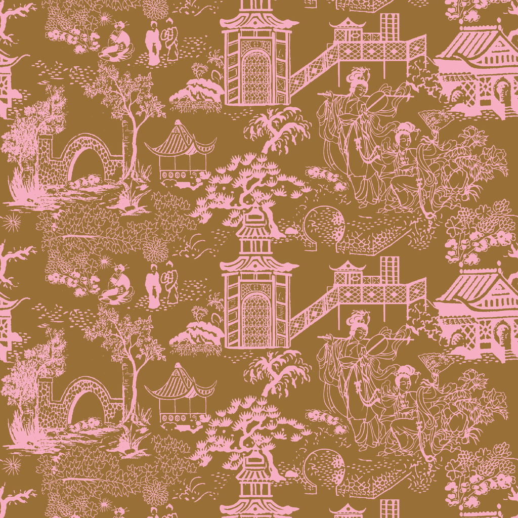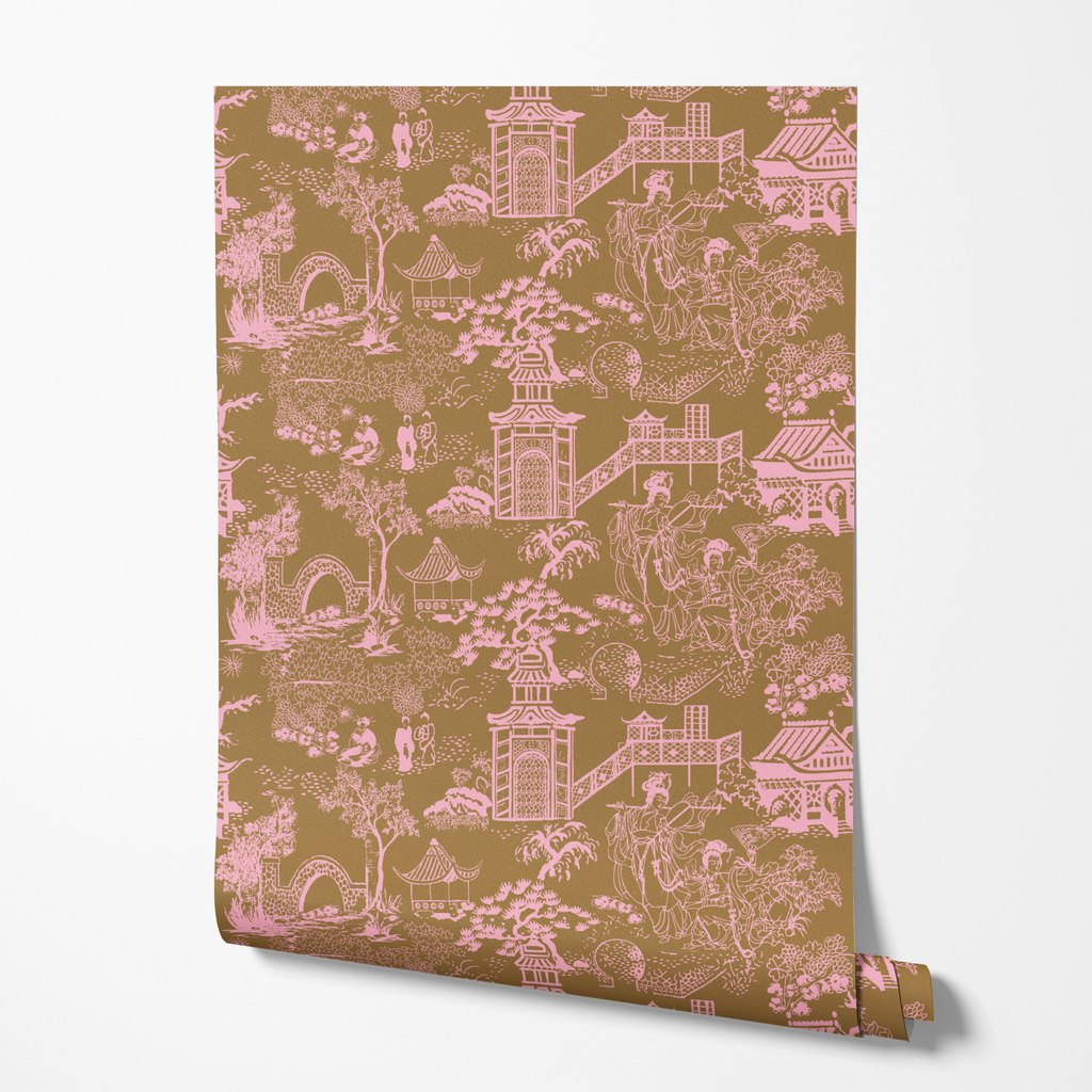 Elegant chinoiserie toile pattern in pink and gold featuring traditional Asian landscapes, pagodas, and botanical elements. Perfect for sophisticated home decor with a heritage touch.