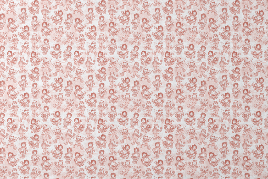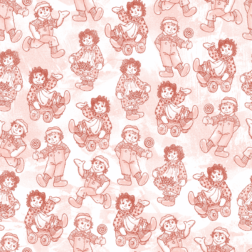 Vintage Raggedy Ann and Andy dolls in soft red tones featuring a nostalgic collection of rag dolls. Perfect for nursery decor or children's fashion.