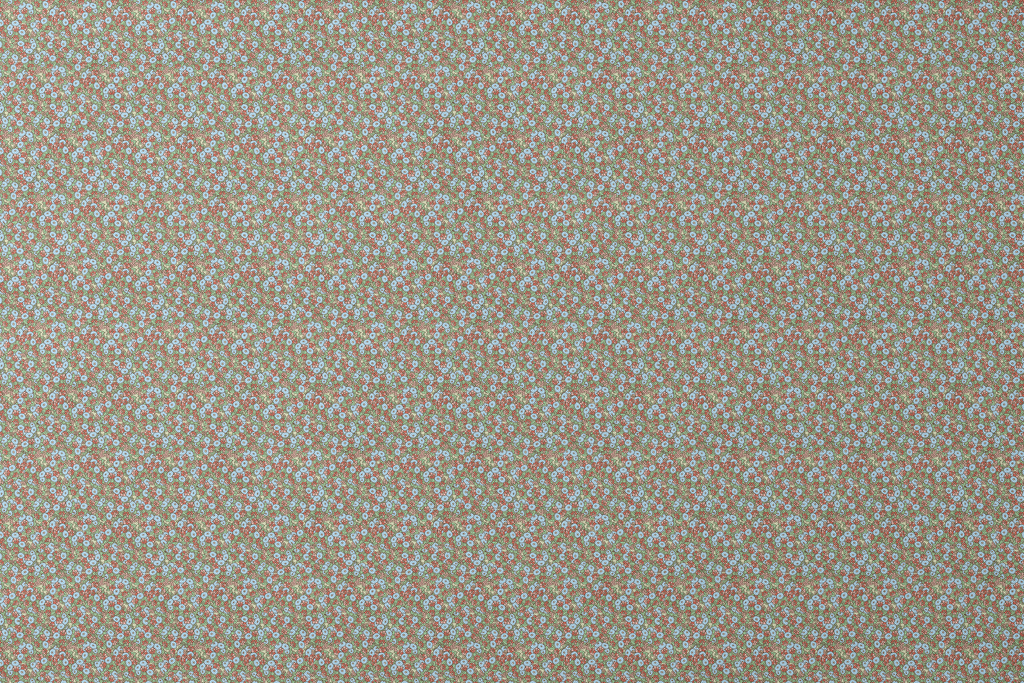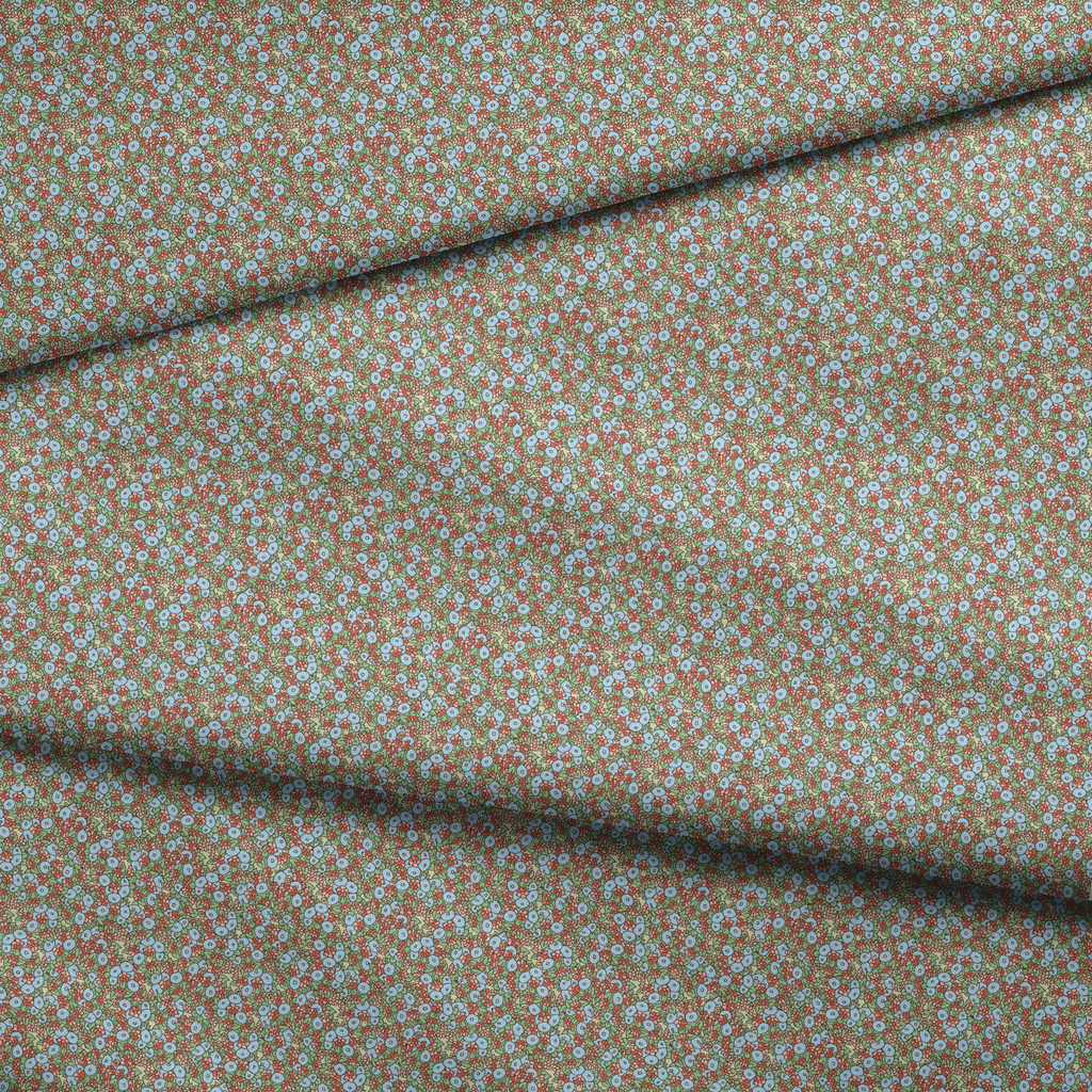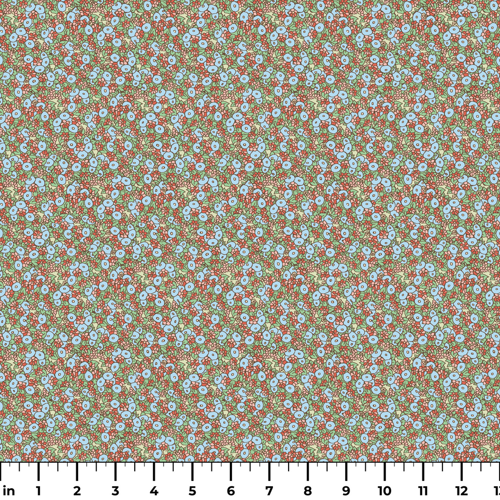 Raggedy Ann and Andy delicate floral print featuring tiny multi-colored flowers with red accents on a warm green background. Perfect for spring sewing projects and vintage-inspired fashion.