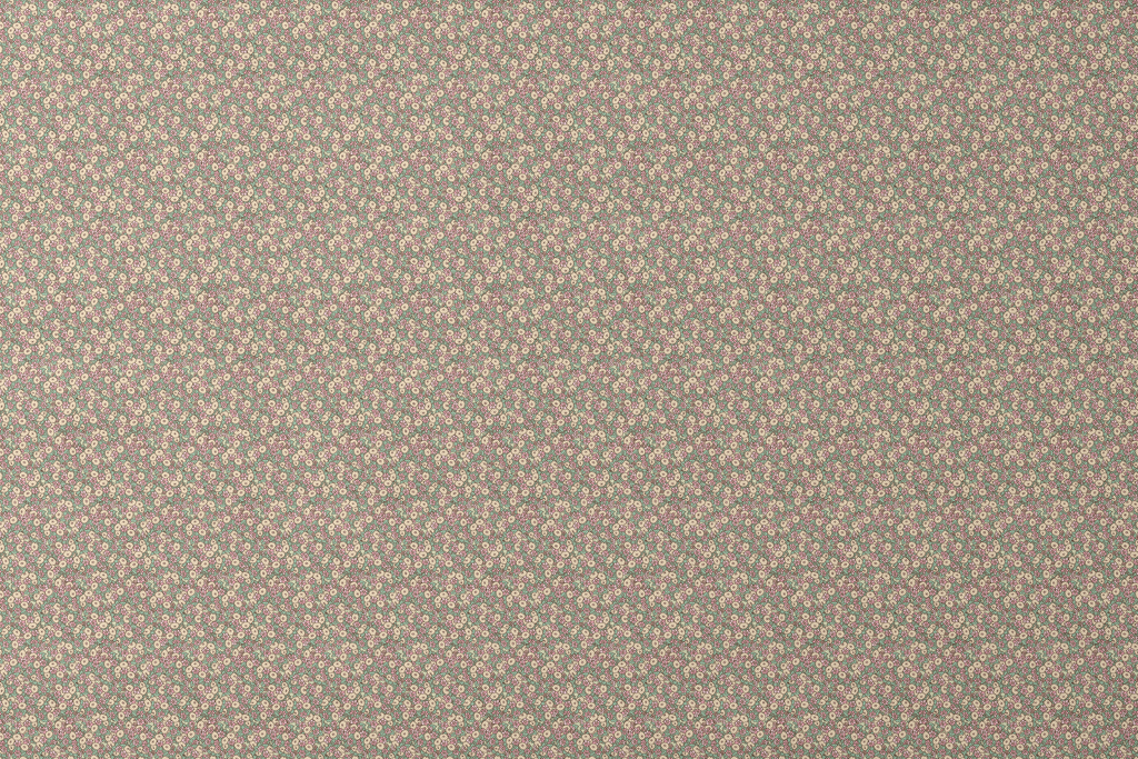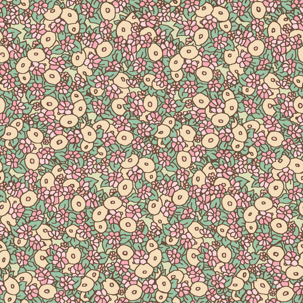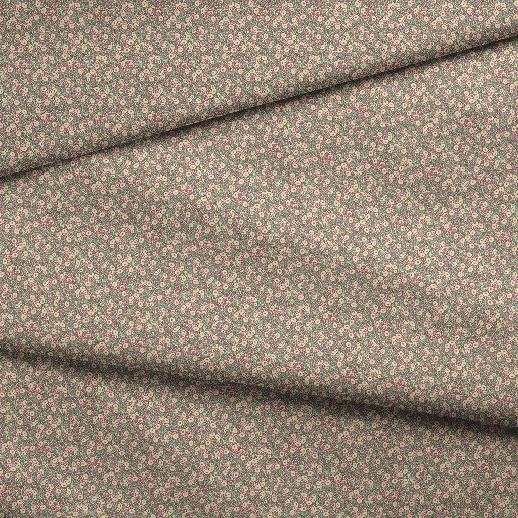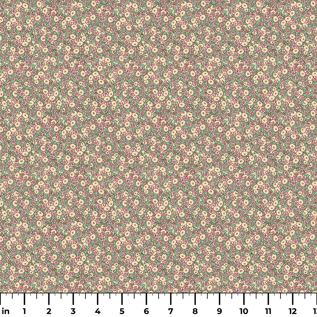 Raggedy Ann and Andy delicate floral print featuring tiny cream-colored flowers with pink accents on a warm green background. Perfect for spring sewing projects and vintage-inspired fashion.