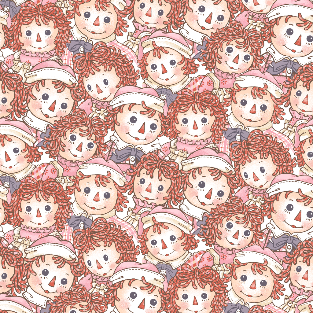 Adorable Raggedy Ann and Andy pattern featuring cute ragdolls with red yarn hair, rosy cheeks, and button eyes. This showcases classic rag dolls in soft pink colors, perfect for nursery decor or children's crafts.