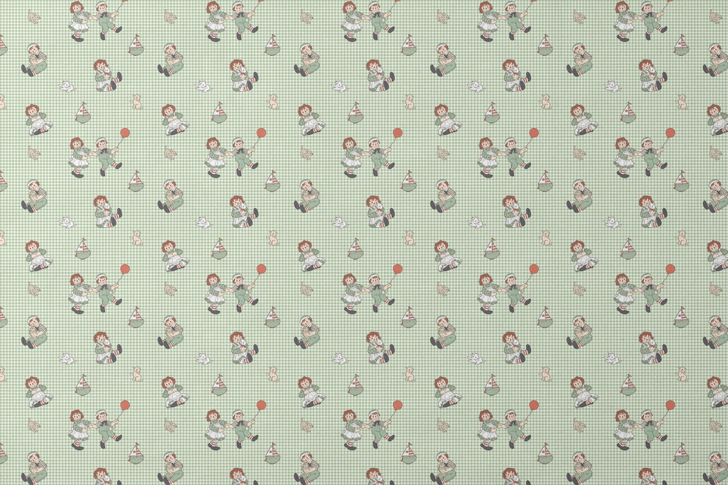 Charming Raggedy Ann and Andy vintage-style illustration pattern featuring rag dolls and toy figures on a light green gingham background. Perfect for nursery decor or children's projects.