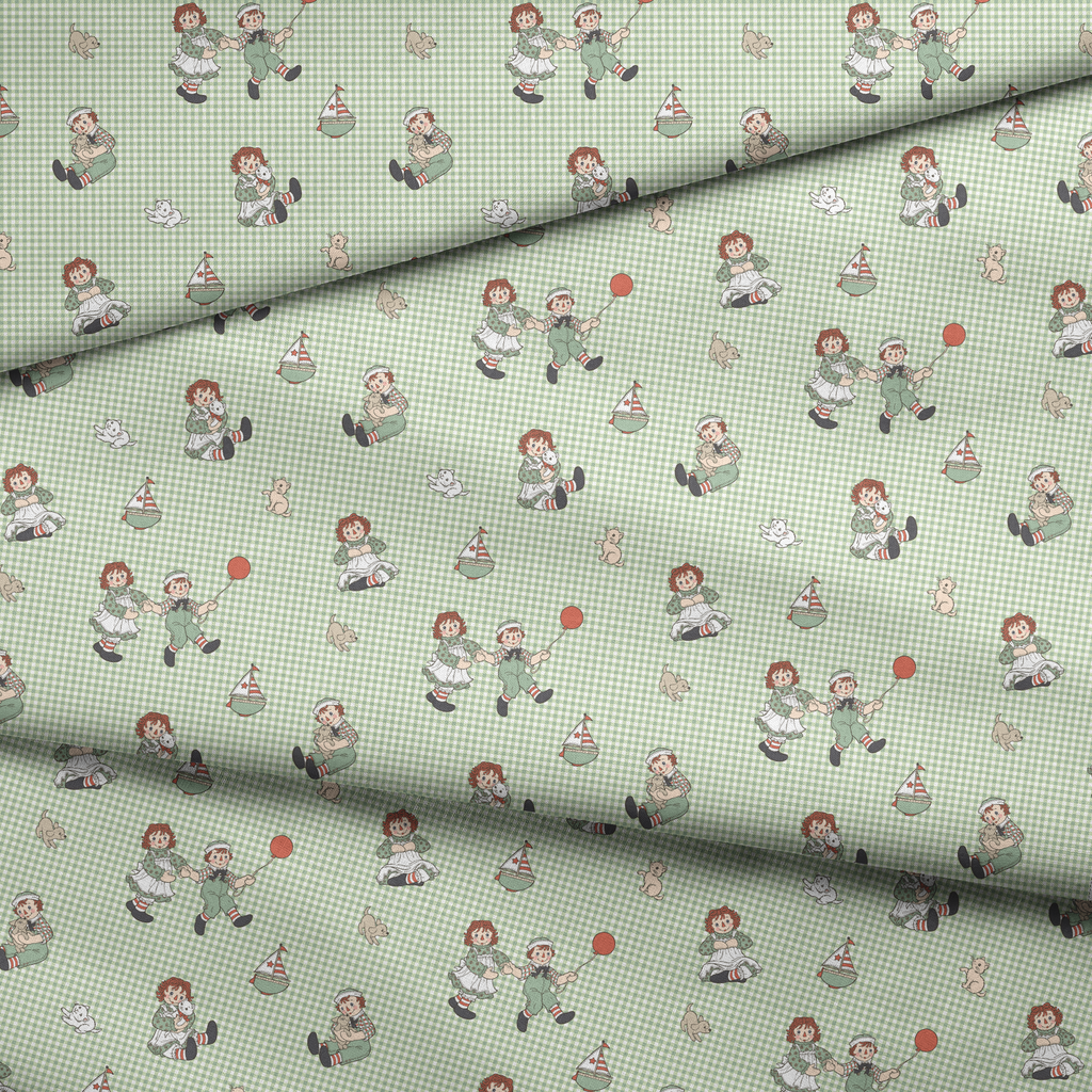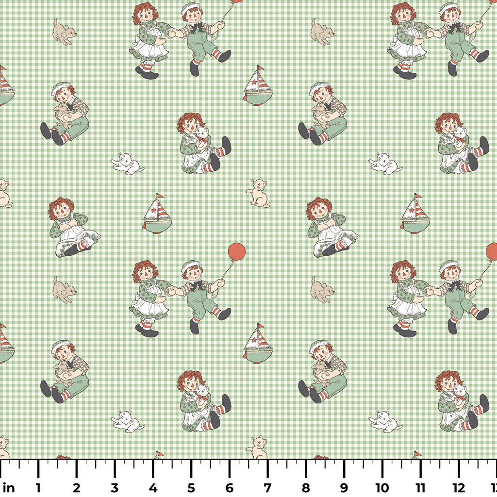Raggedy Ann and Andy Plaid Toss Green Fabric