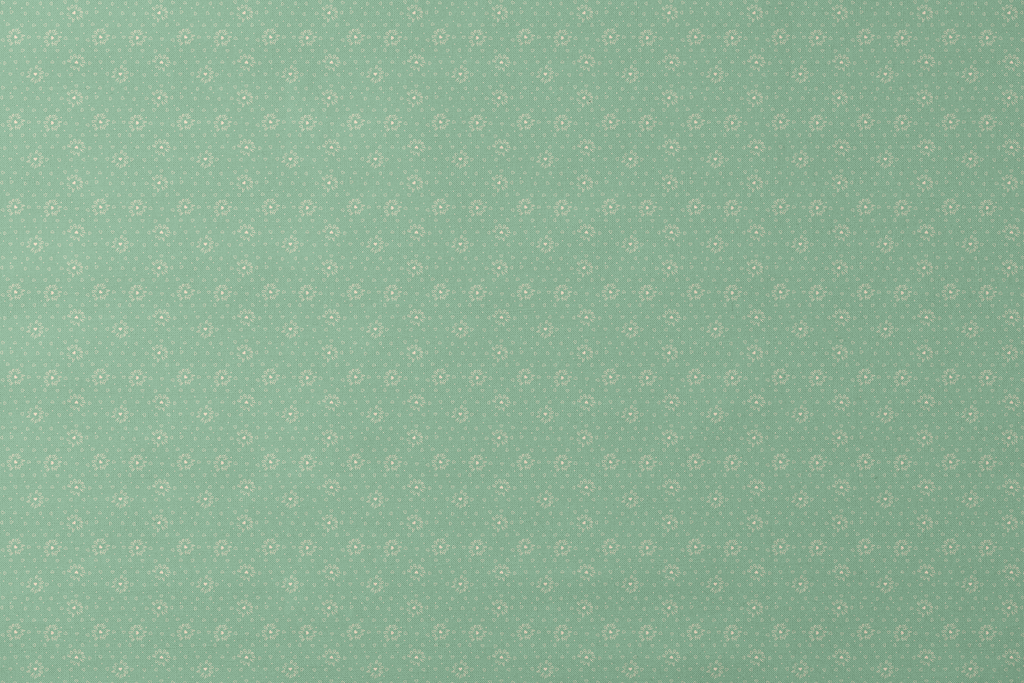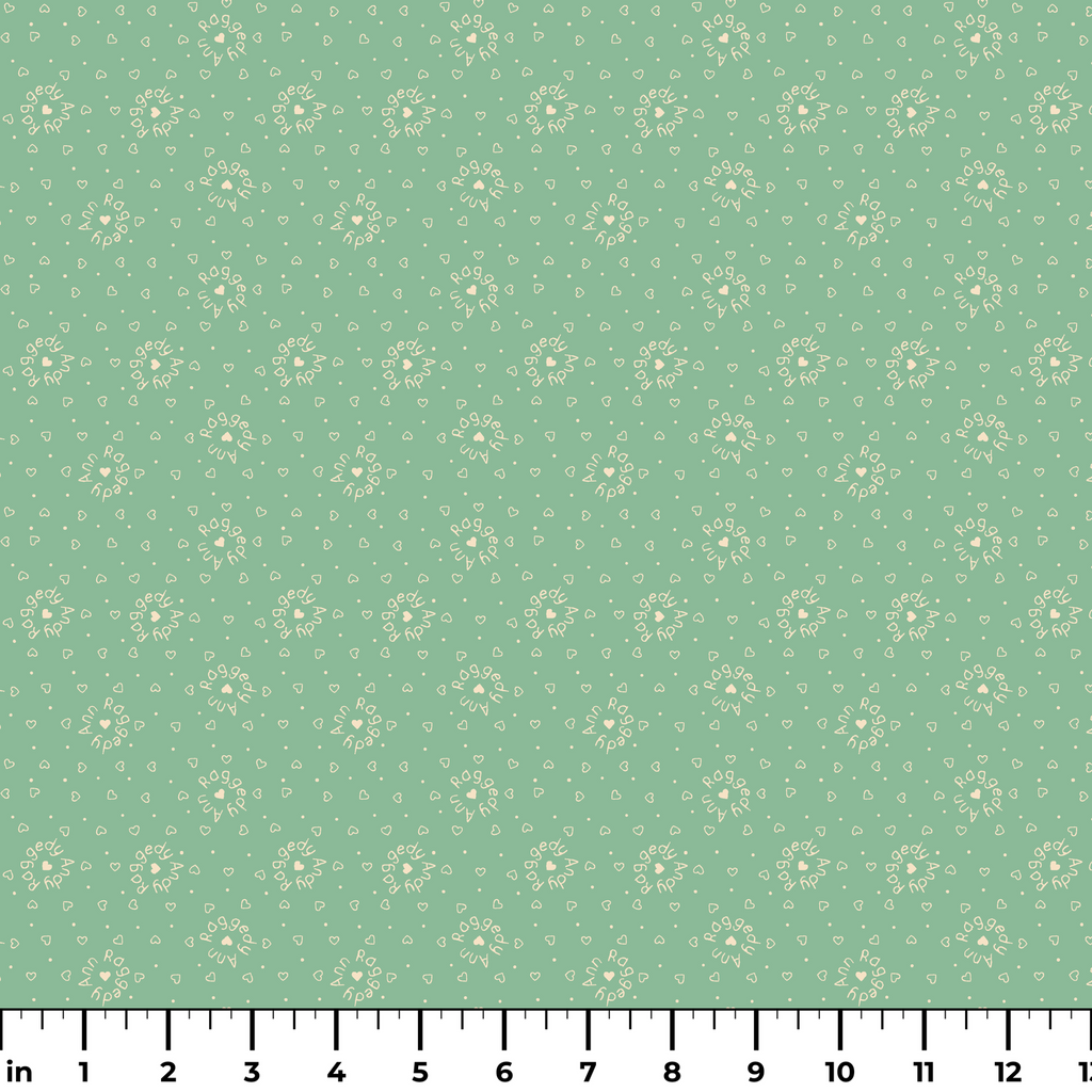 This charming Raggedy Ann and Andy green print features a scattered pattern of cream-colored hearts and circular text motifs. Perfect for craft projects or home décor projects.