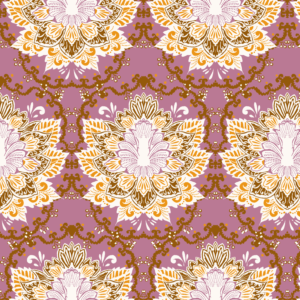 Elegant purple and gold baroque damask pattern featuring ornate medallions with white lotus flowers and intricate scrollwork in a luxurious Victorian-inspired symmetrical design.