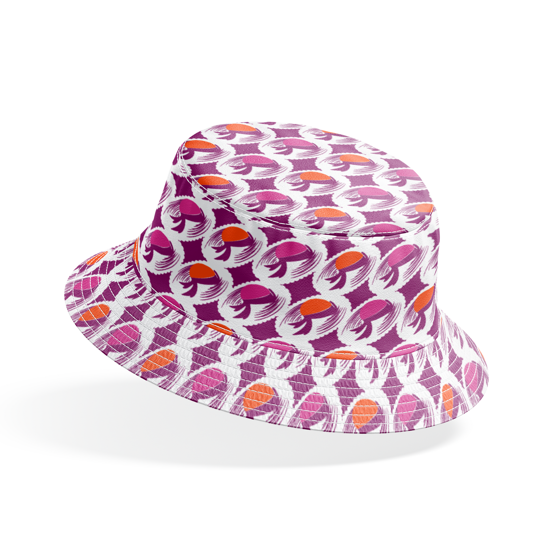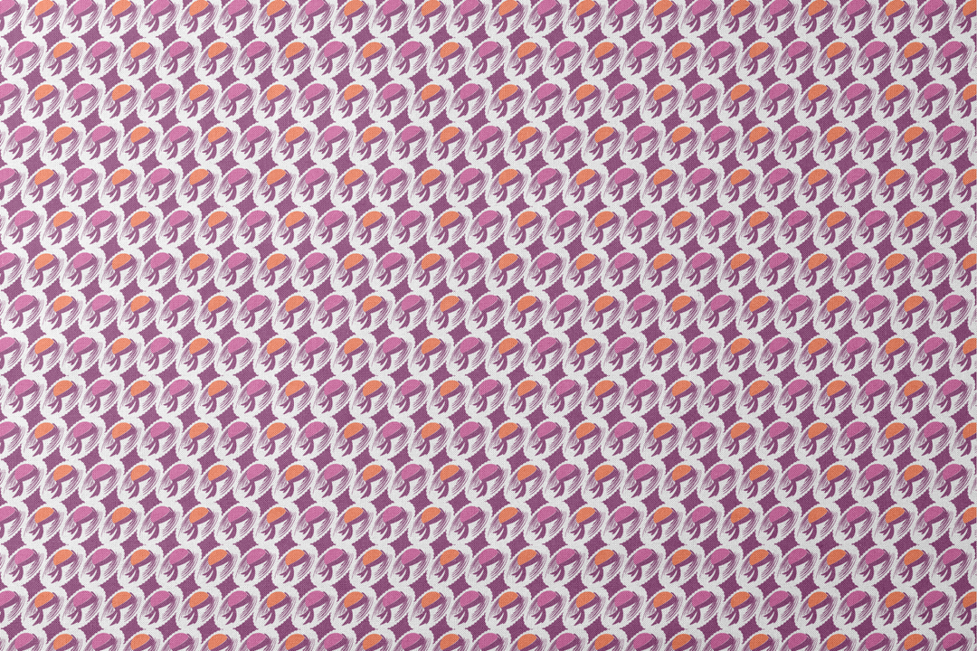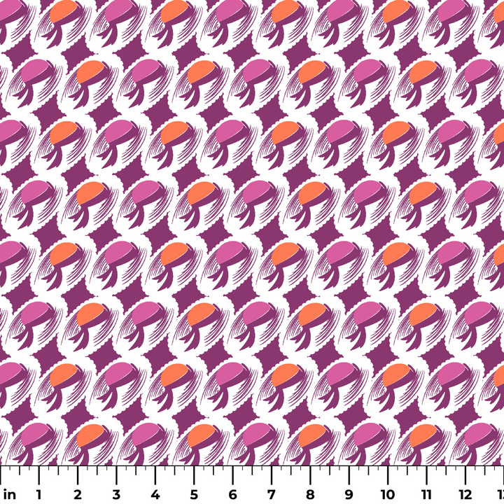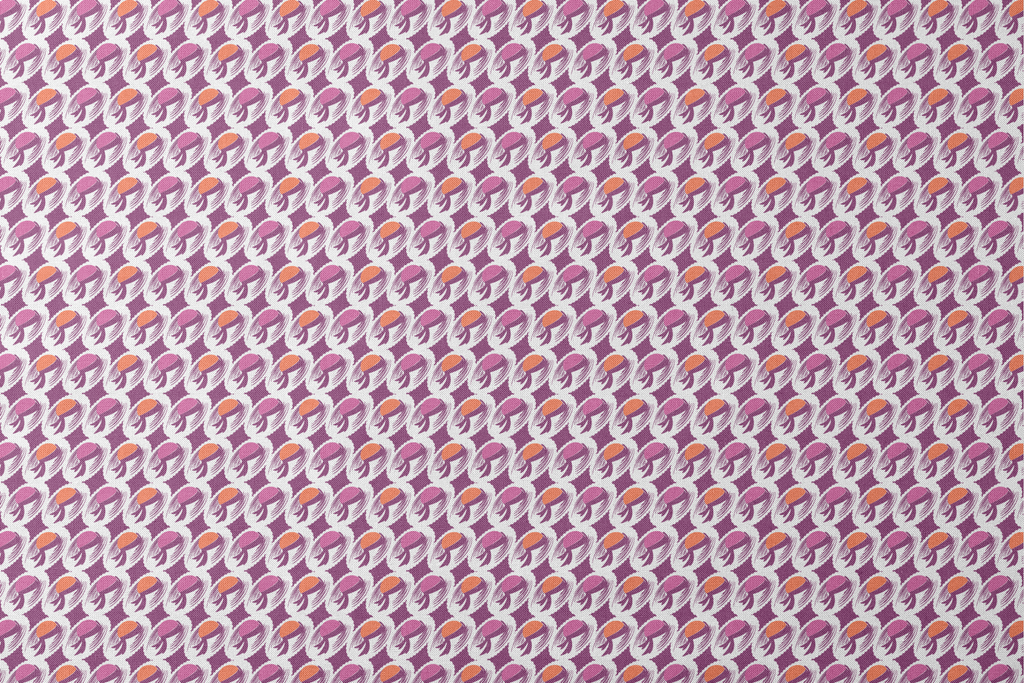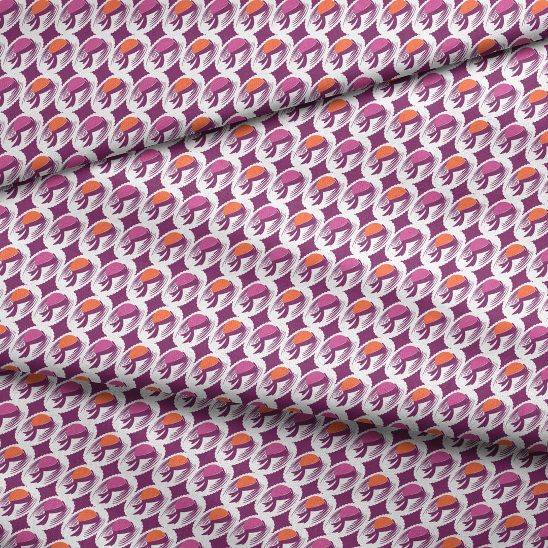 Abstract swirls and organic shapes dance across this retro-inspired pattern in vibrant purple and orange hues, creating a bold, eye-catching design perfect for sewing home decor and unique apparel.