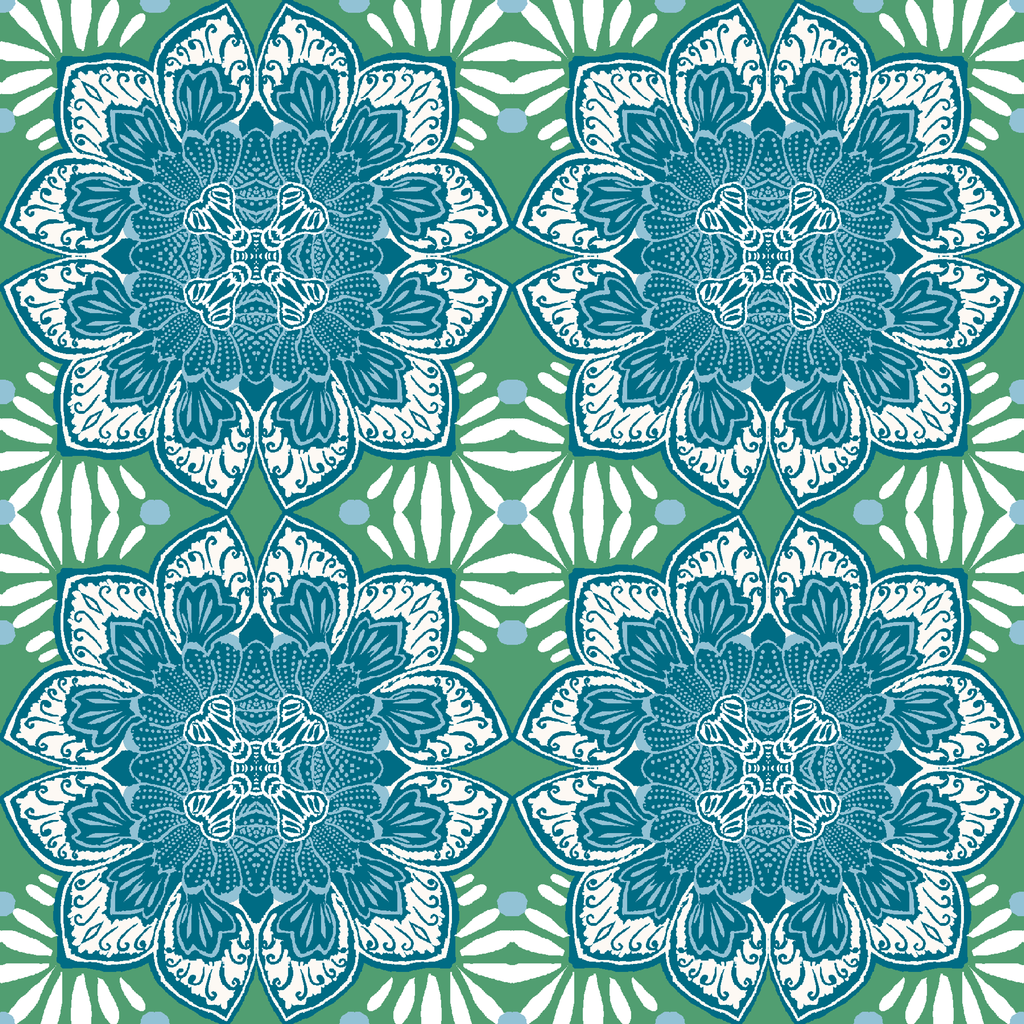 Vintage inspired kaleidoscopic floral pattern in rich teal blue and green, featuring intricate medallion motifs against a retro sunburst background.