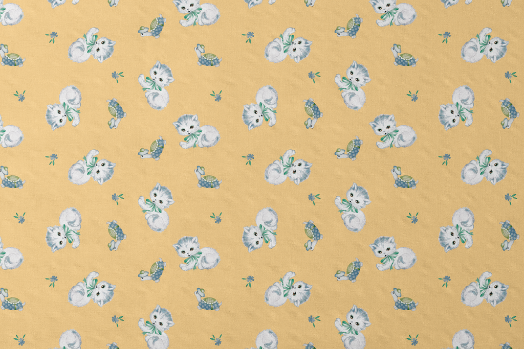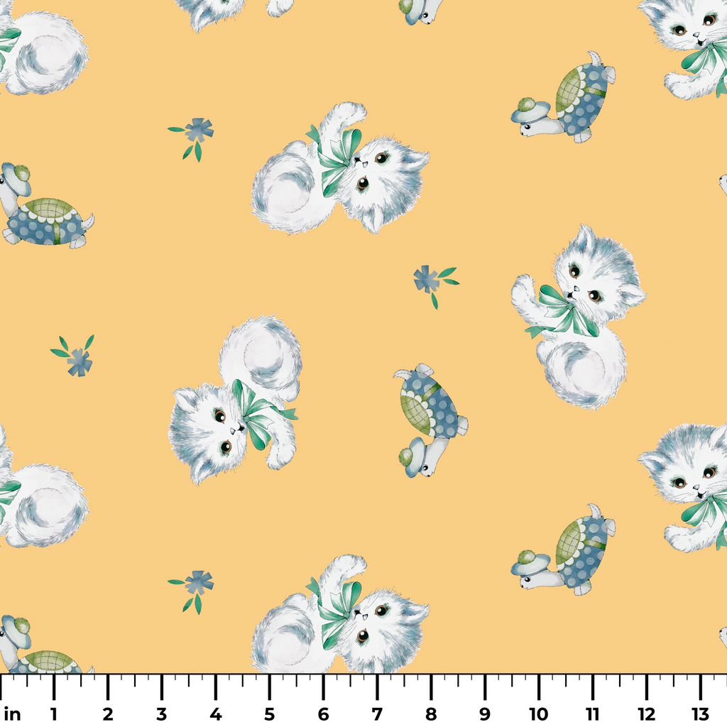 Adorable white kittens with green bows and blue flowers scattered on warm yellow background in charming illustrated style perfect for nursery decor and cat lovers.
