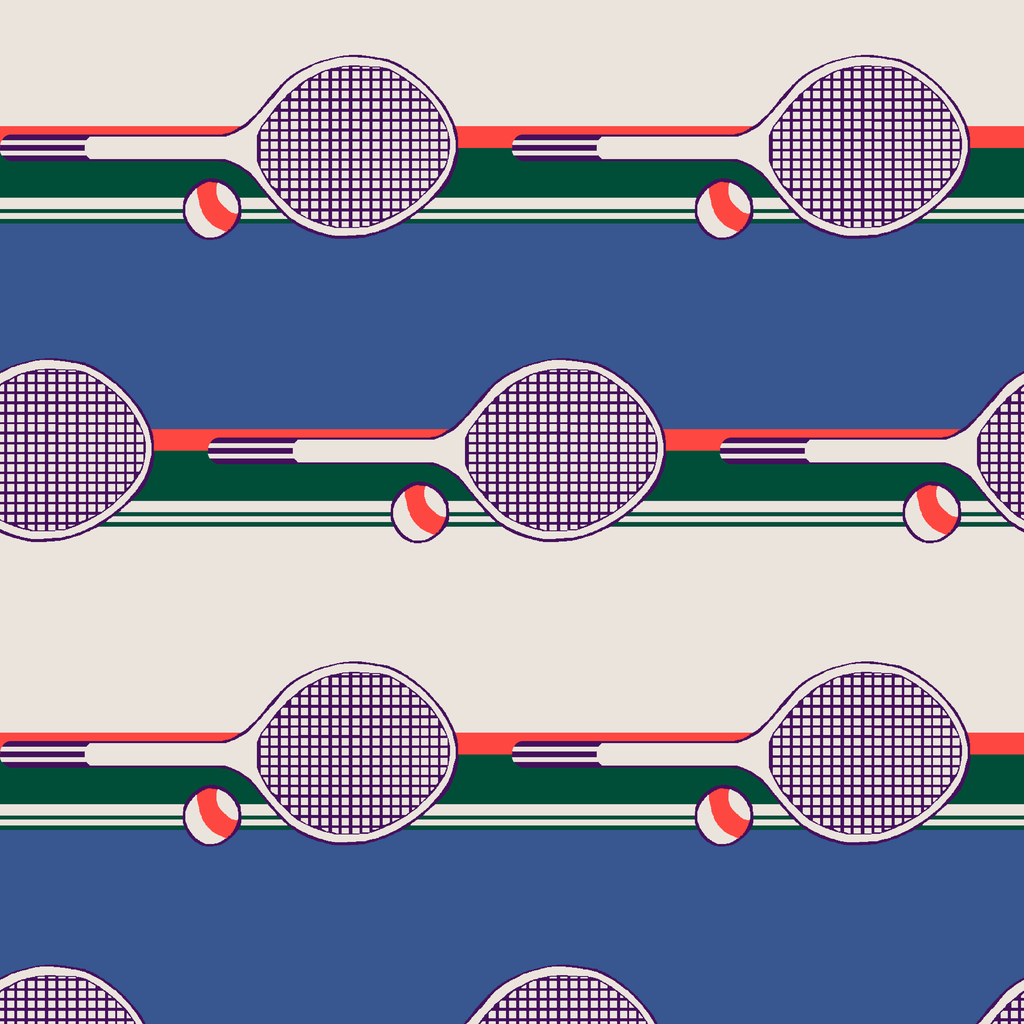 Retro tennis racquet pattern with red, green, and navy stripes on beige background featuring a vintage preppy athletic design perfect for sports enthusiasts and classic style lovers.