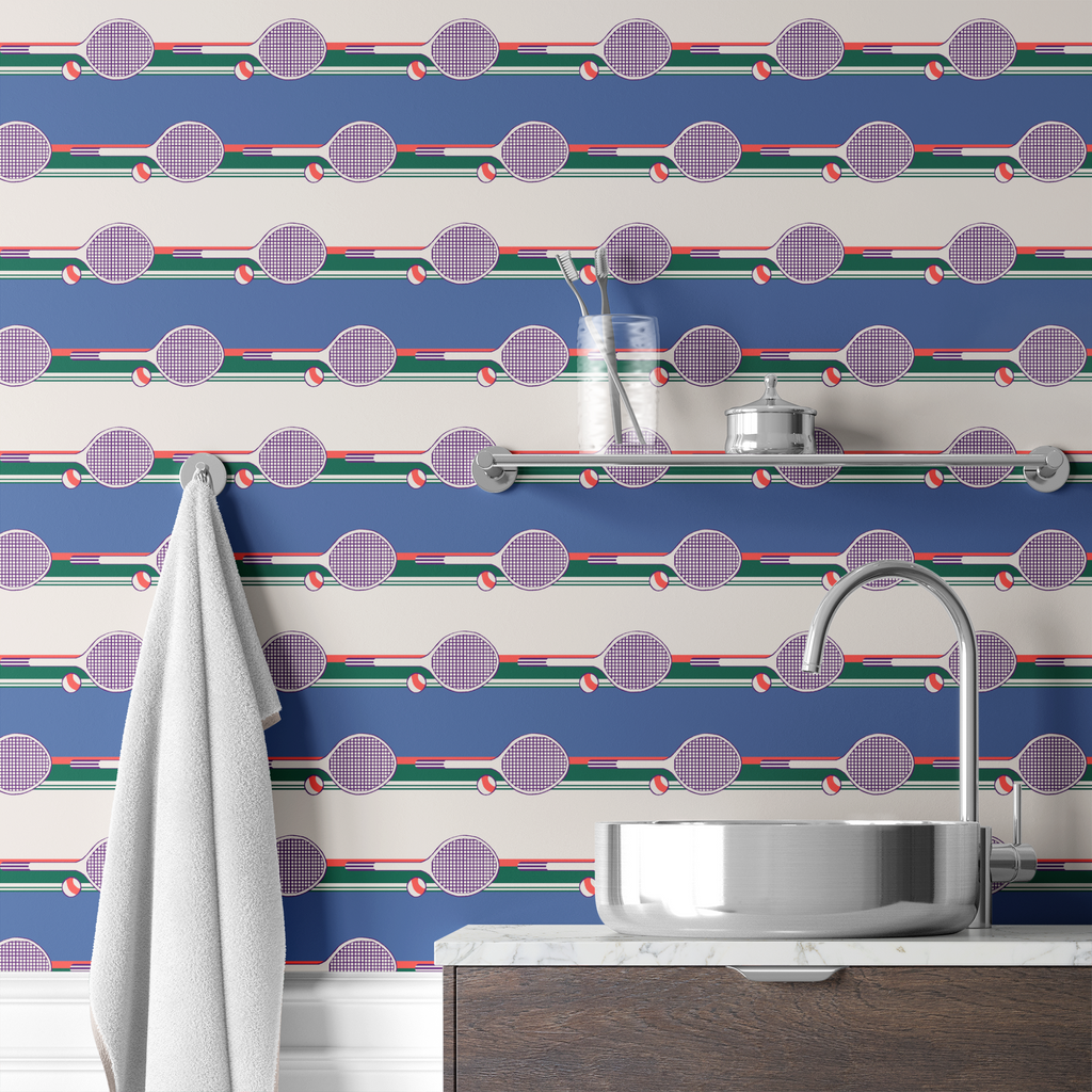 Retro Tennis Racquet Stripe in Blue Wallpaper