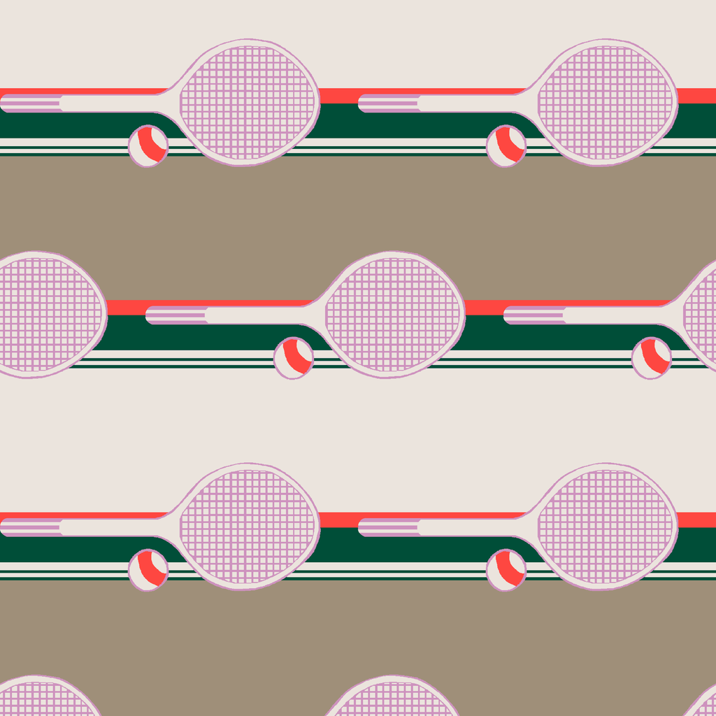 Retro tennis racket pattern with pink mesh strings, red and green stripes on beige background for vintage sports style.