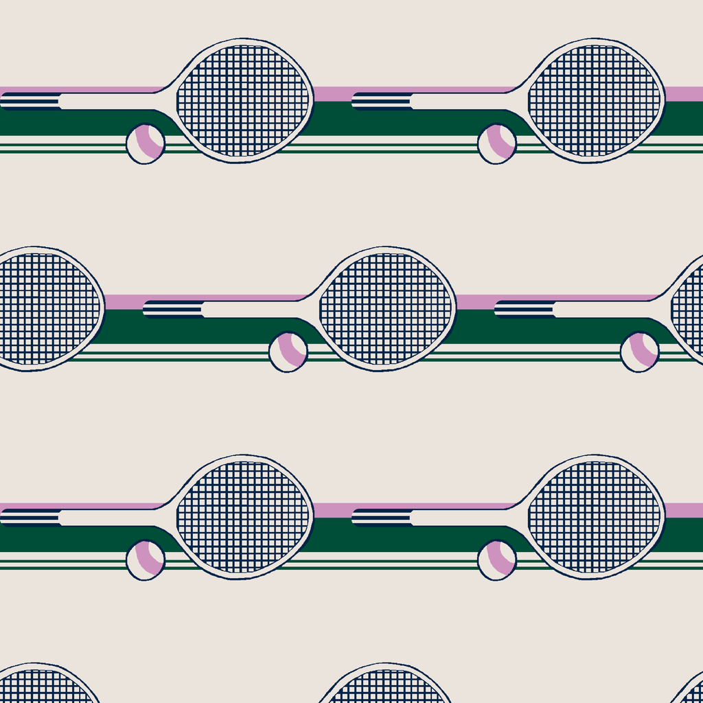 Retro tennis racquet pattern with pink and green stripes creates a preppy vintage sports design perfect for country club style.