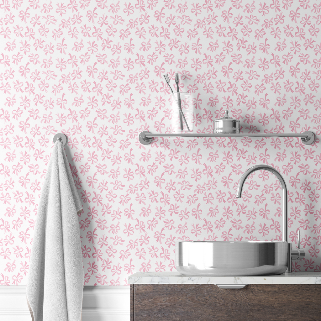 Delicate pink bow pattern on a white packground, perfect for a feminine romantic aesthetic.