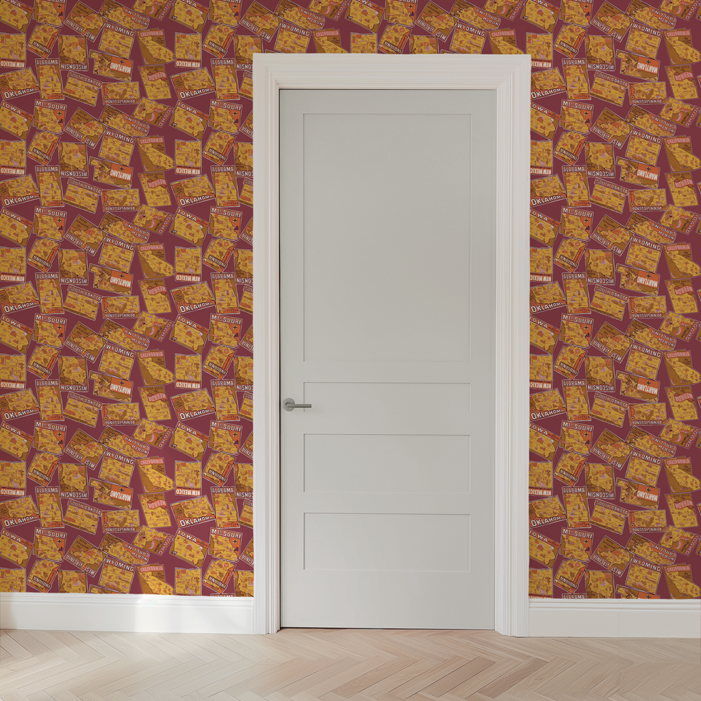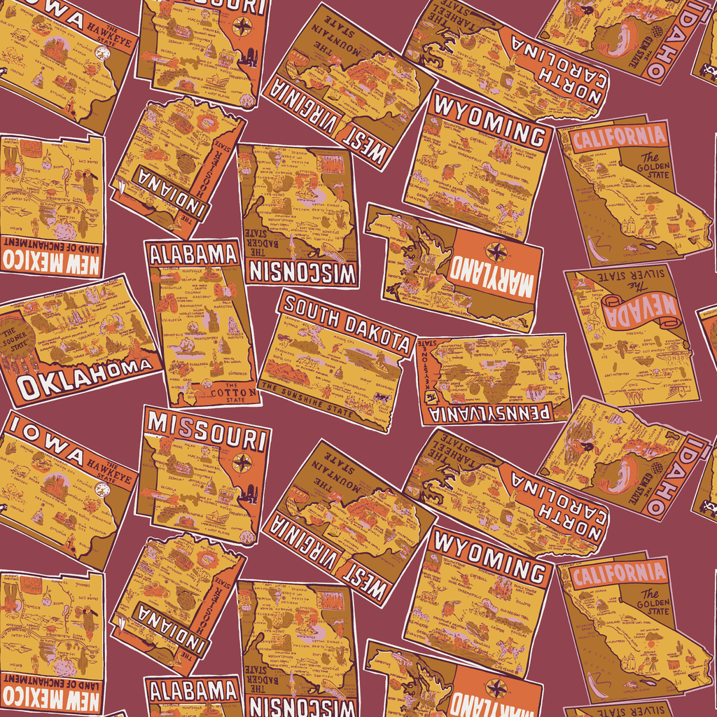 Vintage travel-inspired pattern featuring U.S. state map designs in yellow and plum tones. Perfect for any space.