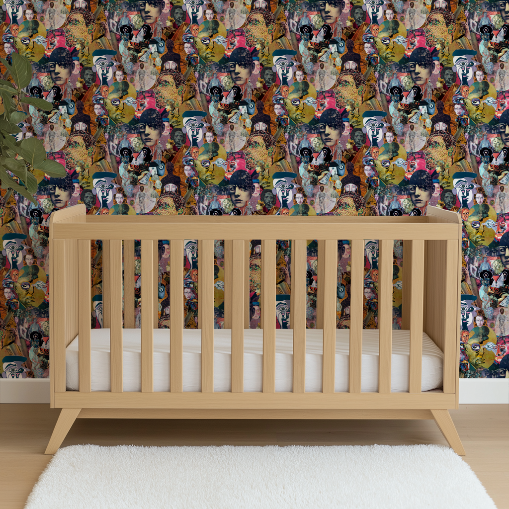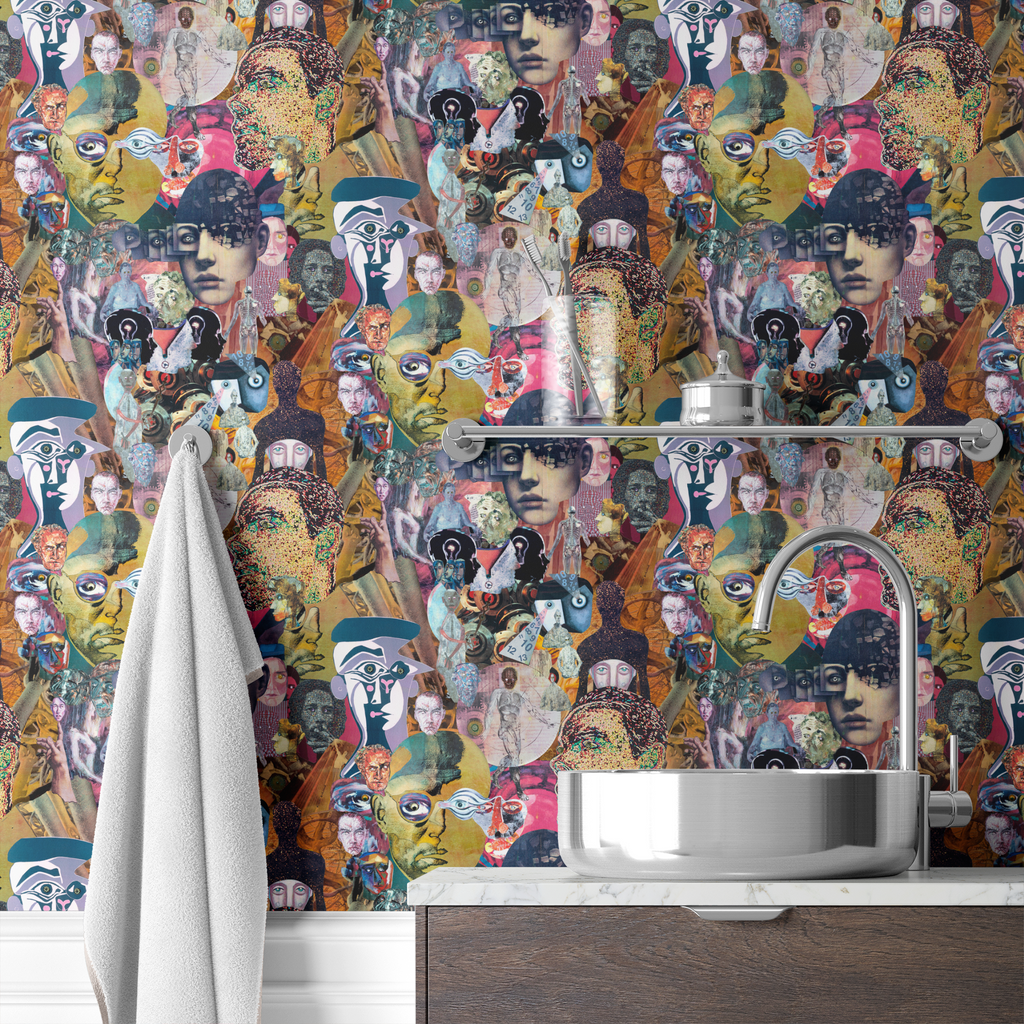 Vibrant collage art featuring diverse abstract faces and bold eyes in a psychedelic, mixed-media style. Bold colors and artistic expressions create a captivating, contemporary portrait montage. Perfect for a vivid touch to any room.